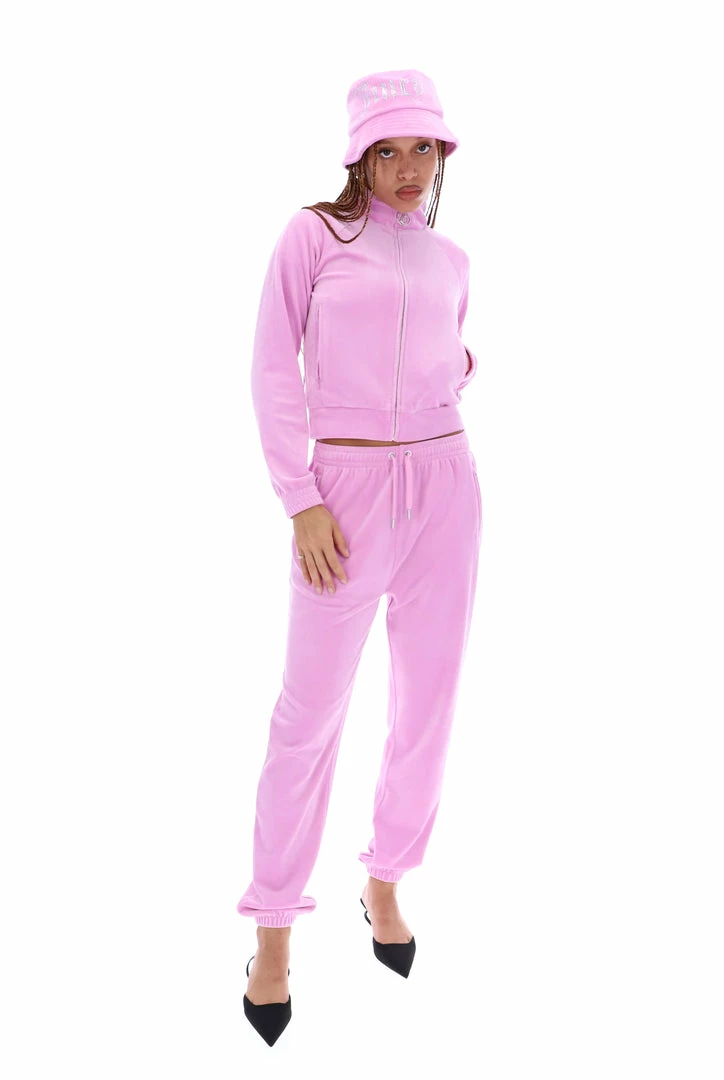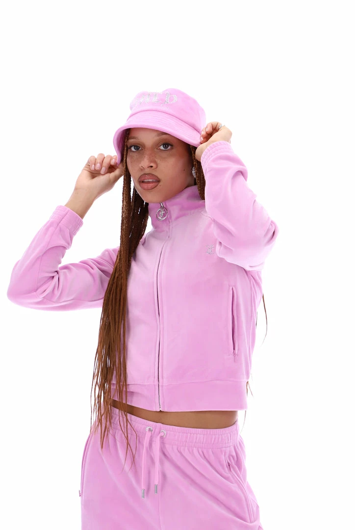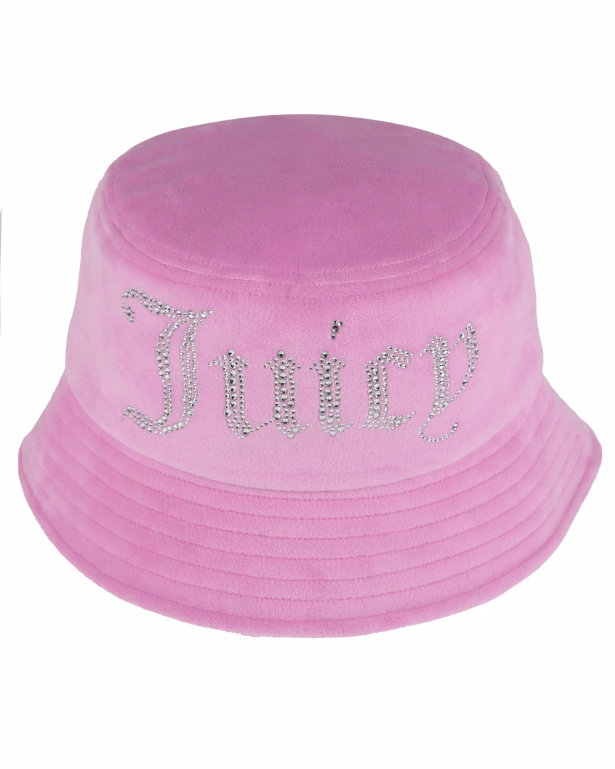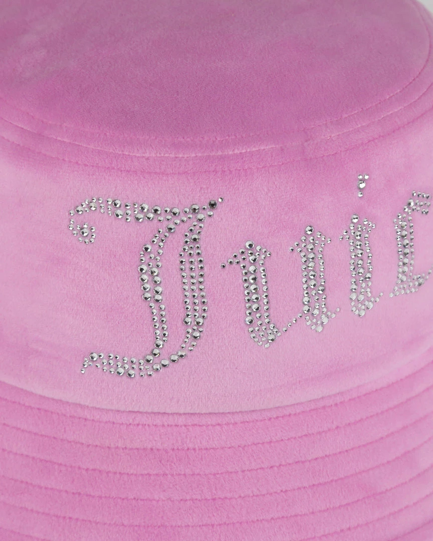 Bucket hat in orchid classic velour. This hat is embellished with ‘Juicy’ diamante branding at front