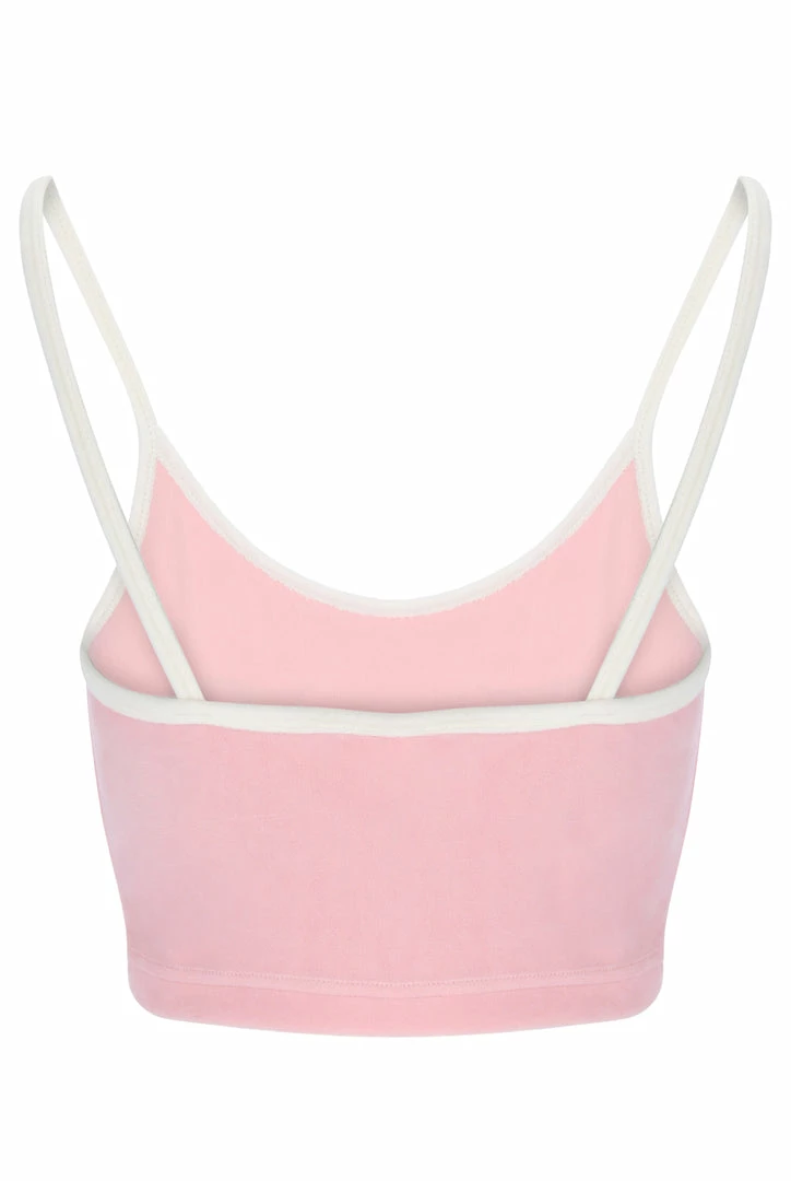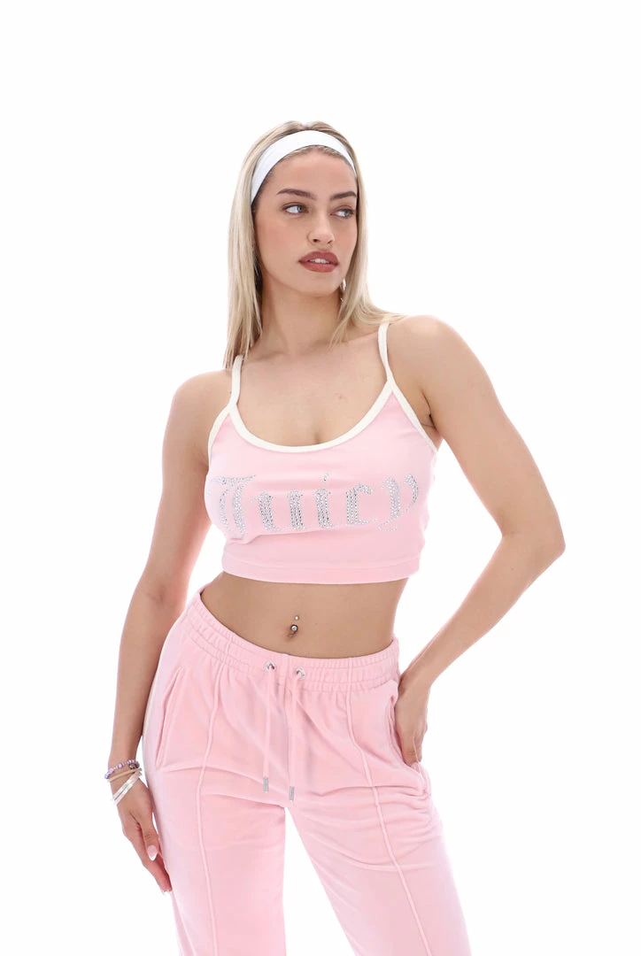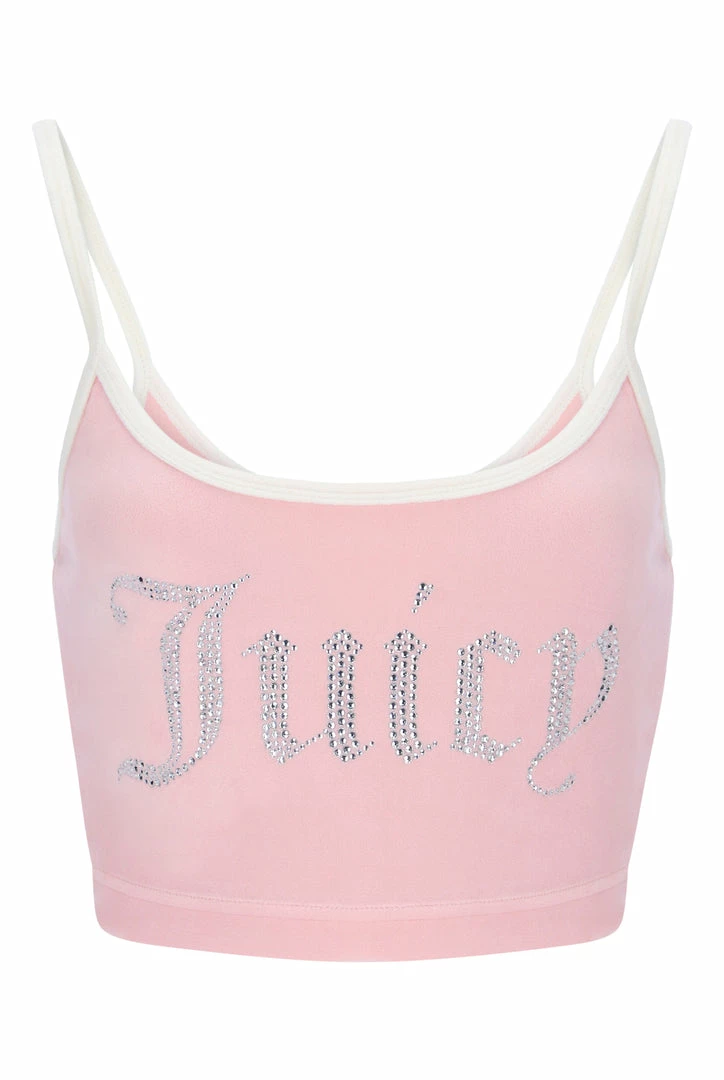 Velour diamante crop in almond blossom. This crop top is branded with Juicy diamante embellishment across chest and features contrast straps.