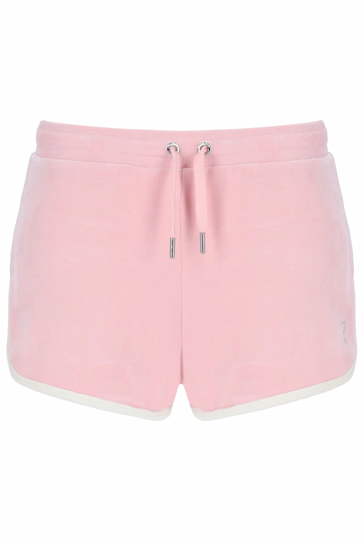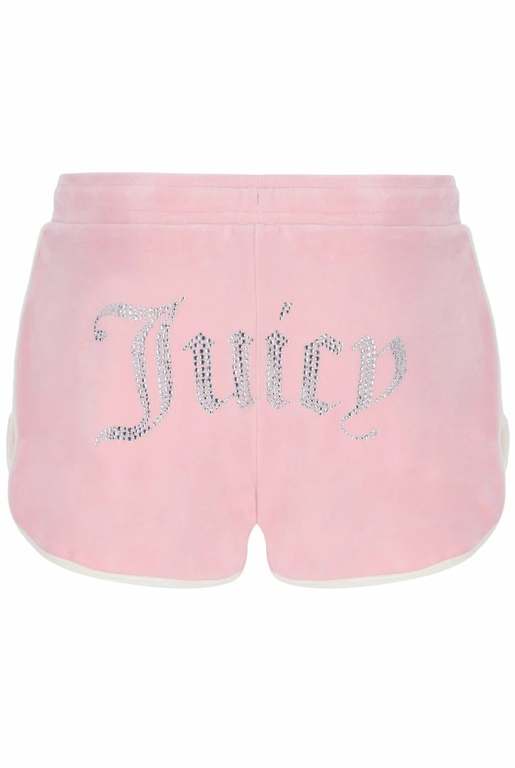 Diamante embellished track shorts in almond blossom classic velour. Mid-rise fit, with adjustable drawstring waist and zip pockets. These shorts feature statement diamante branding on the back, contrast stripe detailing and silver branded hardware. Pair with the matching track top for a summer fit of the iconic Juicy Couture tracksuit.
