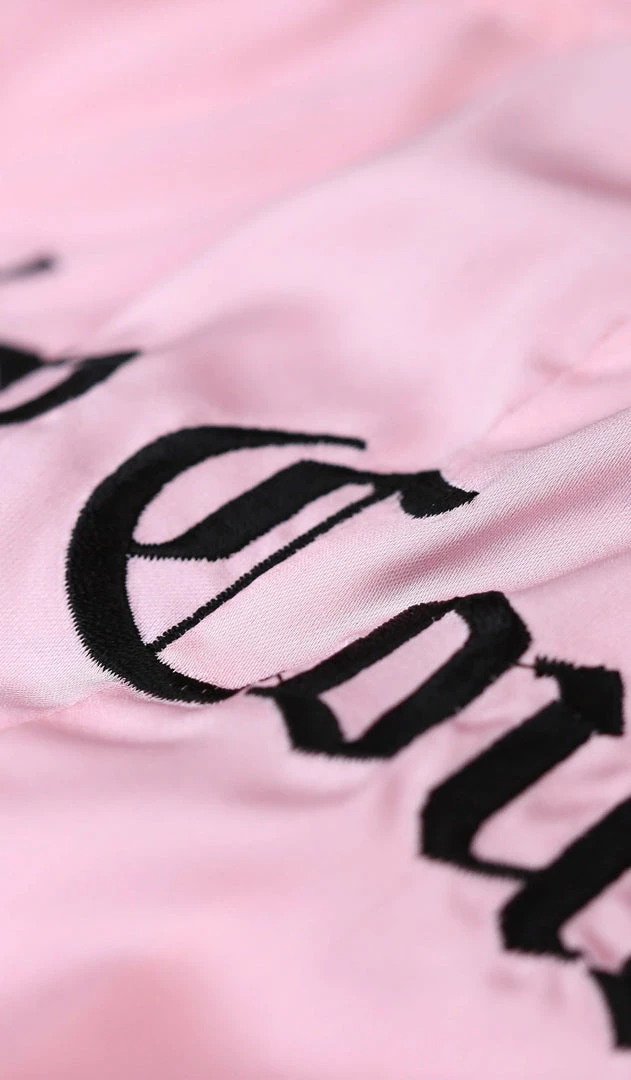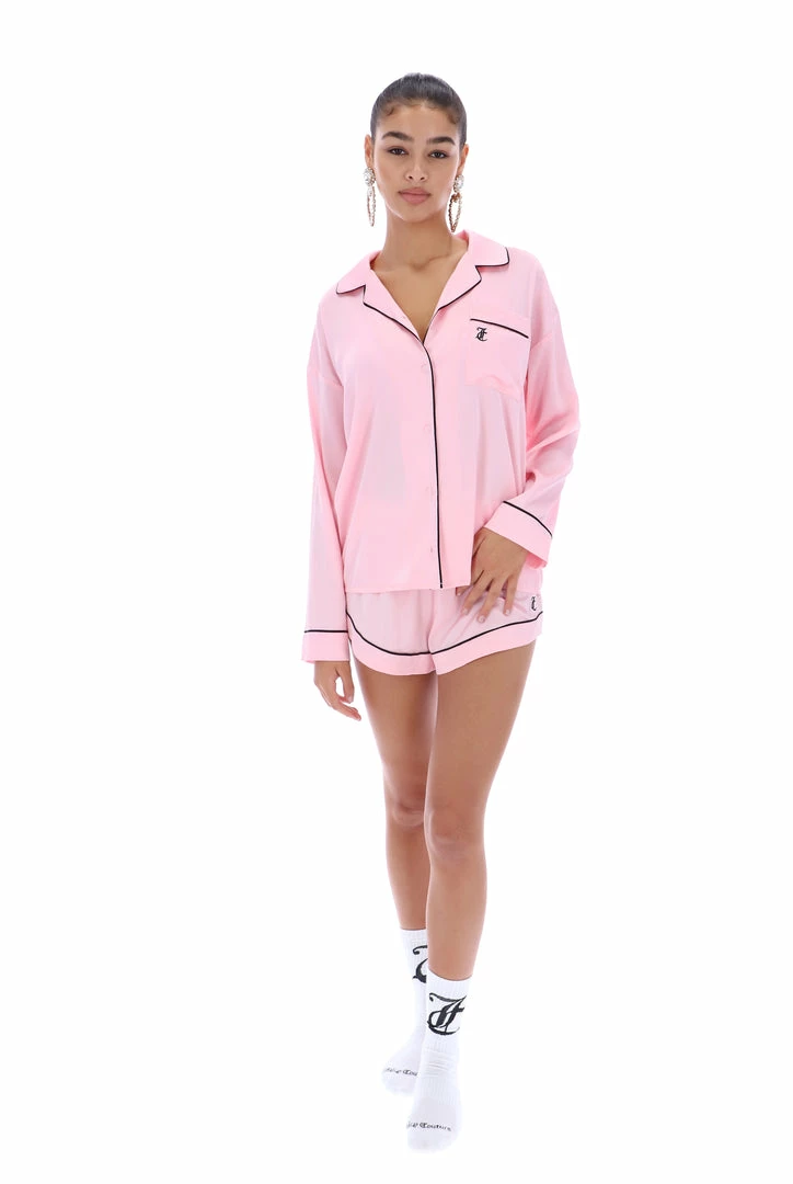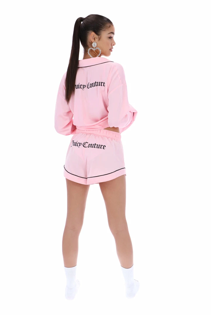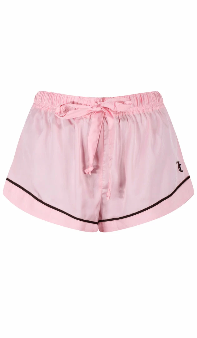 Satin pyjama shorts with contrast piping detail. These mid-rise shorts feature a skirted fit, secure satin tie at the waist and are finished with a JC embroidery branding at the hip.