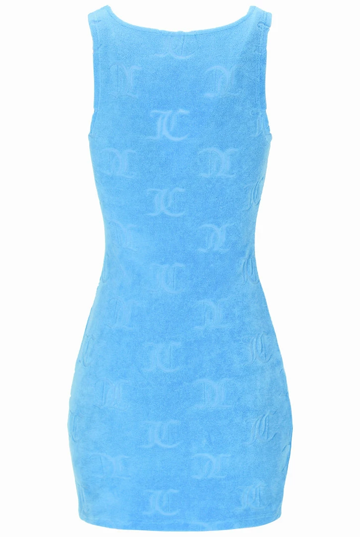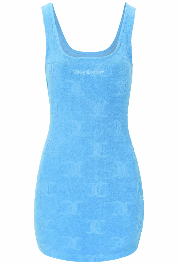 Fitted monogram jacquard tank dress in aqua recycled terry towelling. This short bodycon dress features a tonal ‘Juicy Couture’ logo across chest and is branded with an all over jacquard monogram ‘JC’ crest. The ultimate seaside dress. RECYCLED TERRY TOWELLING- A breathable cotton fabrication to update your wardrobe for the summer months.