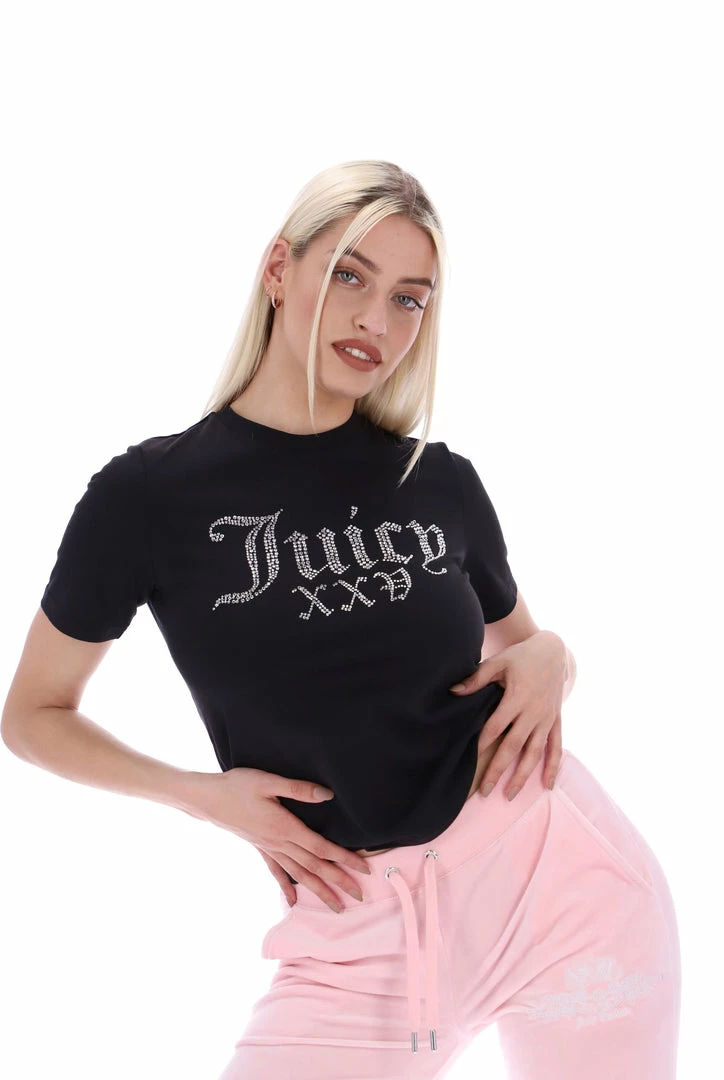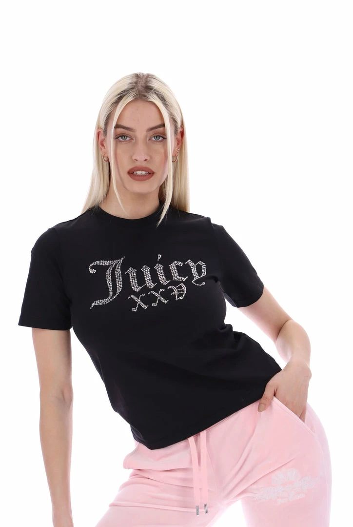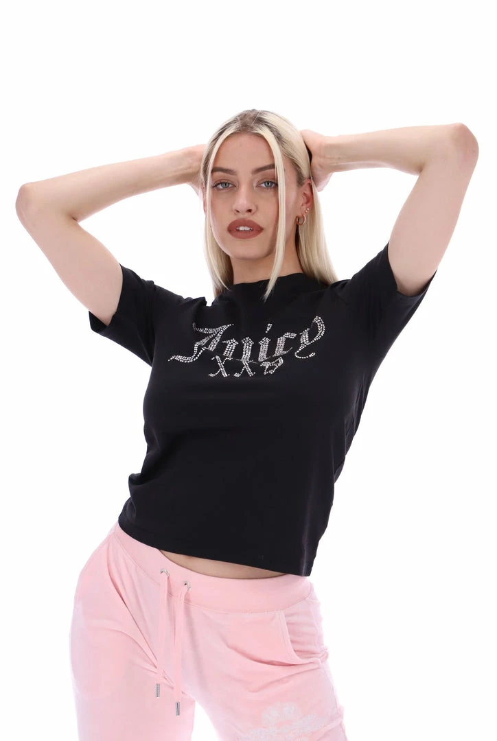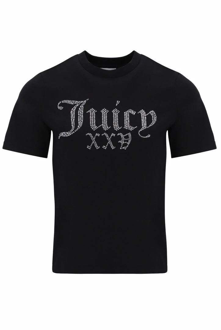 Celebrating 25 years of our iconic tracksuit; black short sleeve numeral diamante girlfriend tee. This crew neck is branded with a diamante ‘Juicy 25’ roman numeral graphic across chest.