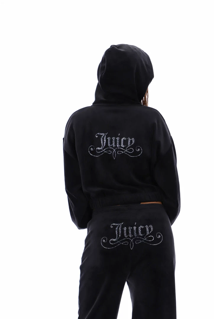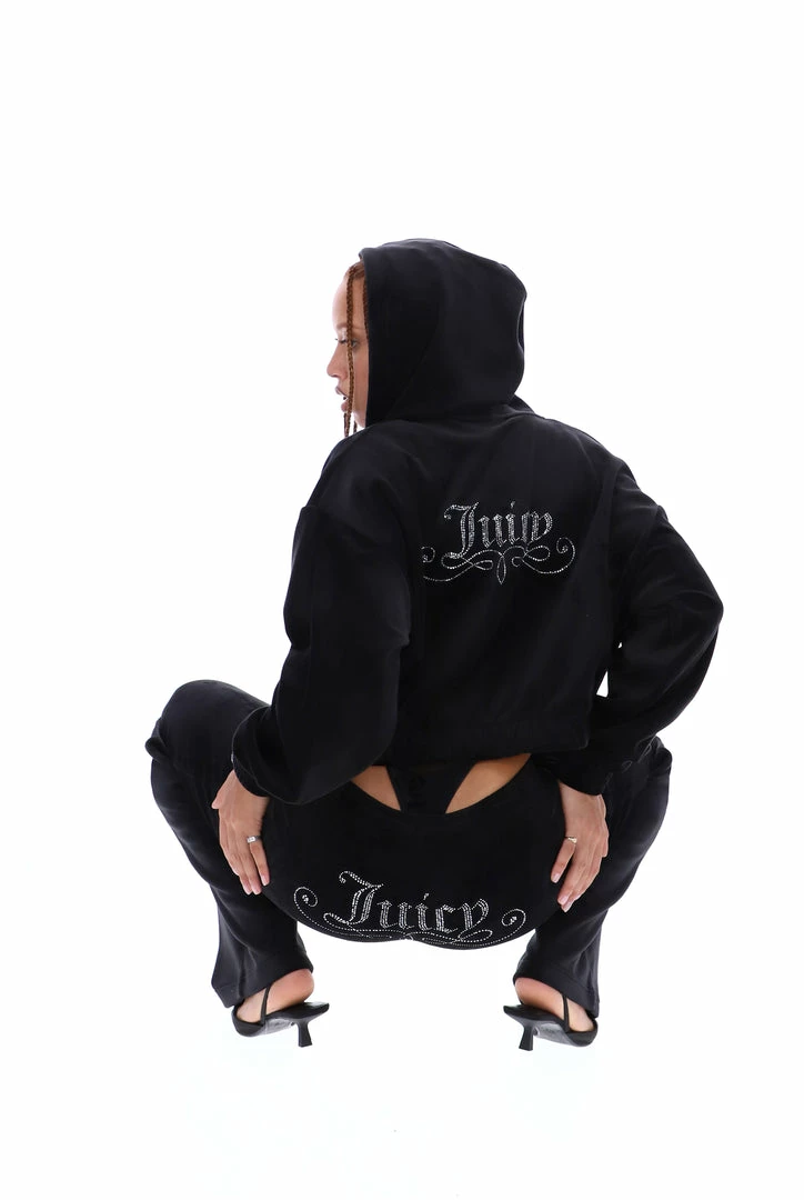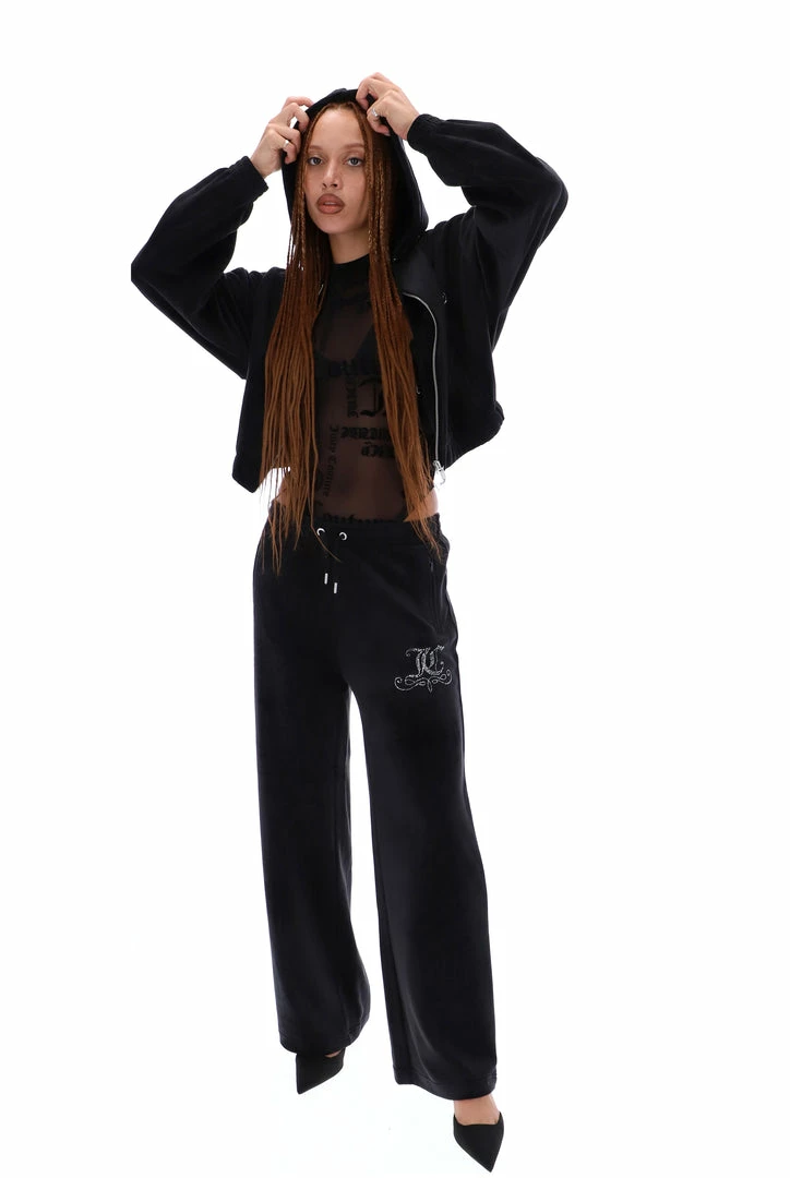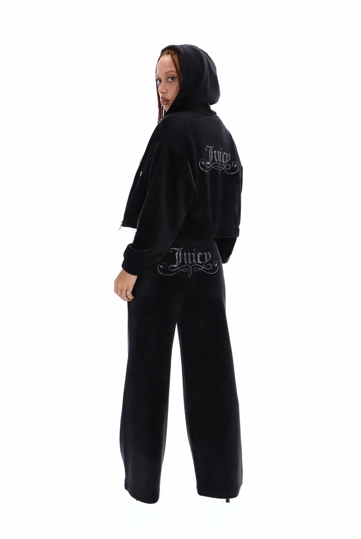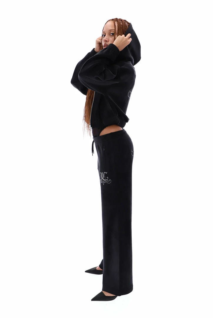 Relaxed wide leg joggers in black bonded classic velour. Mid-rise fit, with adjustable drawstring waist. These bottoms feature zip pockets, JC diamante western crest branding at thigh and Juicy diamante crest at back.