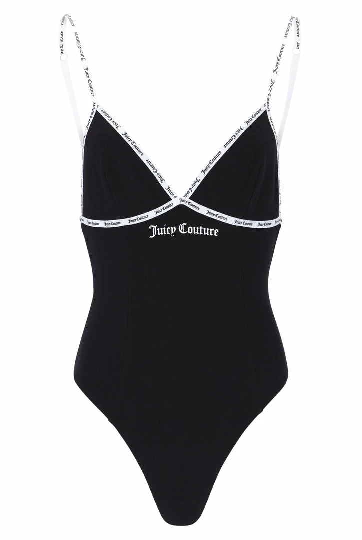 Triangle spaghetti strap body in black single jersey. This bodysuit comes in a stretchable body-shaping material with front stitch seems to sculpt and embrace your figure. Featuring adjustable strap, contrasted elastic tape branding around chest and an injection mould ‘Juicy Couture’ branding across front. Comfortable thong fit with double snap popper fastenings.
