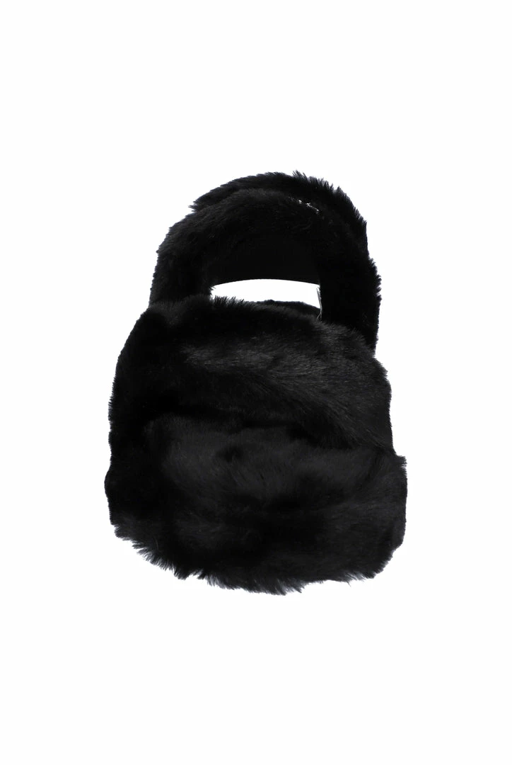 Material: UPPER: FAUX FUR AND BRANDED ELASTIC STRAP OUTSOLE: EVA WRAPPED IN FAUX FUR