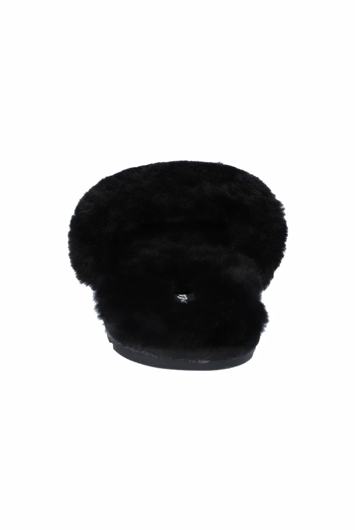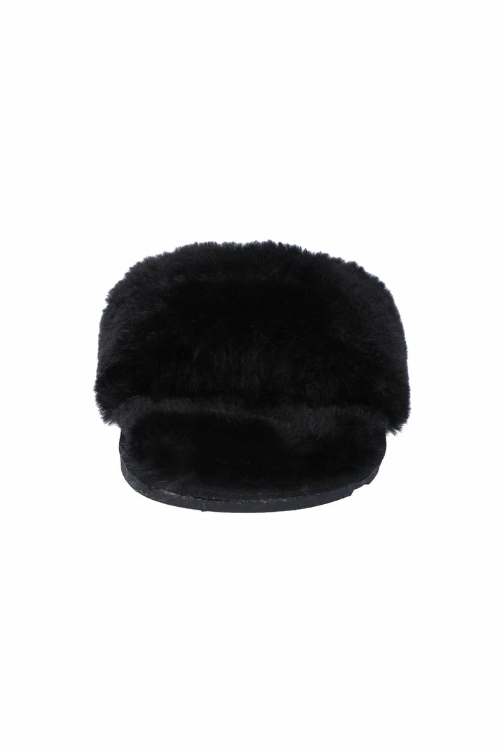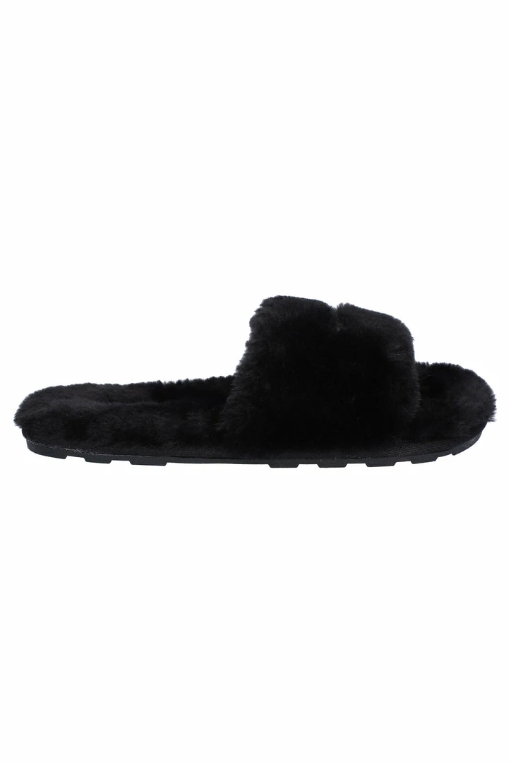 Tonal fur slippers in black sheepskin. This classic slipper features a branded tread outsole offering a wearable experience inside or outside. These are finished with a branded woven label on footbed and a 3D raised metal logo through upper strap.