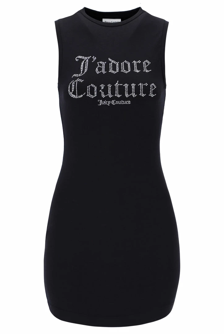 Diamante tank dress in black jersey. This fitted crew neck tank dress features banded arm holes ‘J’adore Couture’ diamante branding across chest.