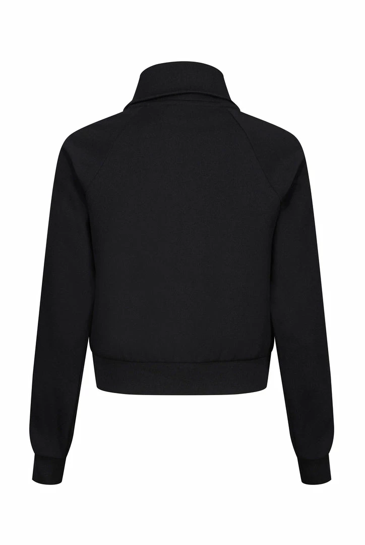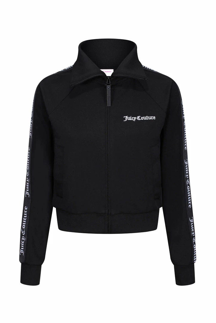 Track jacket in black twill tricot. This deep ribbed funnel neck jacket features a rubberised zip pull, and is branded with a jacquard elastic tape running through sleeves and printed ‘Juicy Couture’ logo at left chest. Pair with the matching joggers for a casual sports look.
