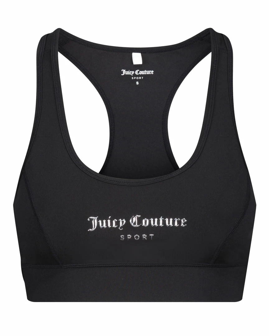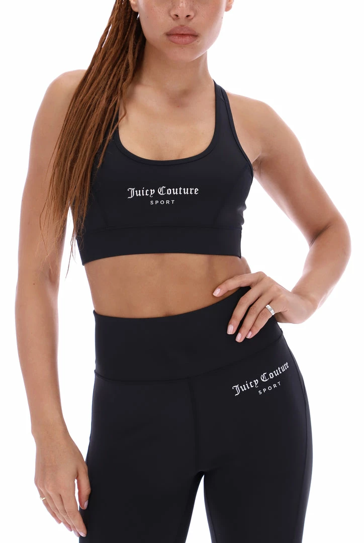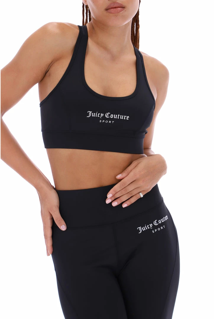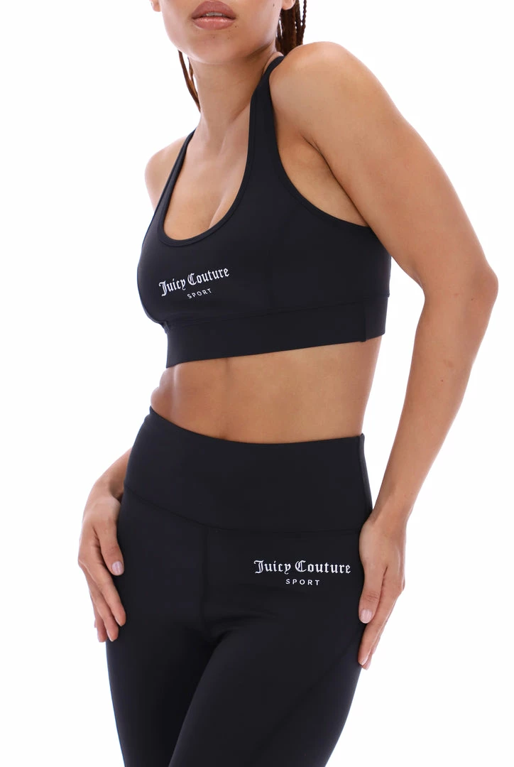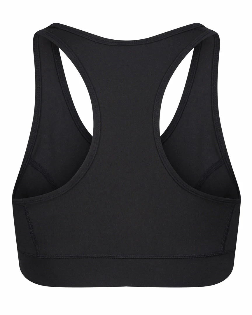 Low impact sports bra in black performance style interlock jersey. This sports bra features an injection mould graphic logo through chest, racer back cut for a sculpted fit and is finished with a banded elastic through hem. Complete the look with the matching shorts for a full sports look.