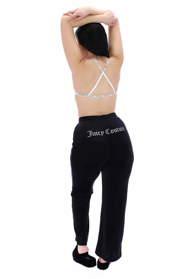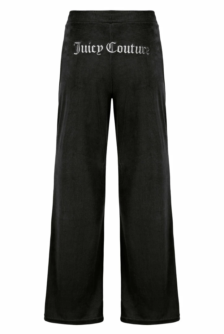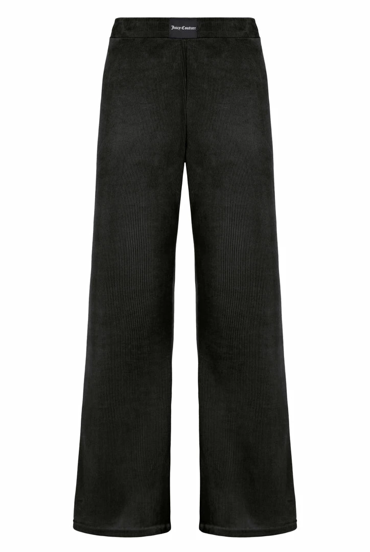 Flare pant in black ribbed velour. These relaxed fit pants feature an elastic waist with a ‘Juicy Couture’ patch branding. Pair with the matching zip hoodie for a luxe lounge look.