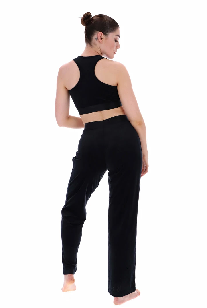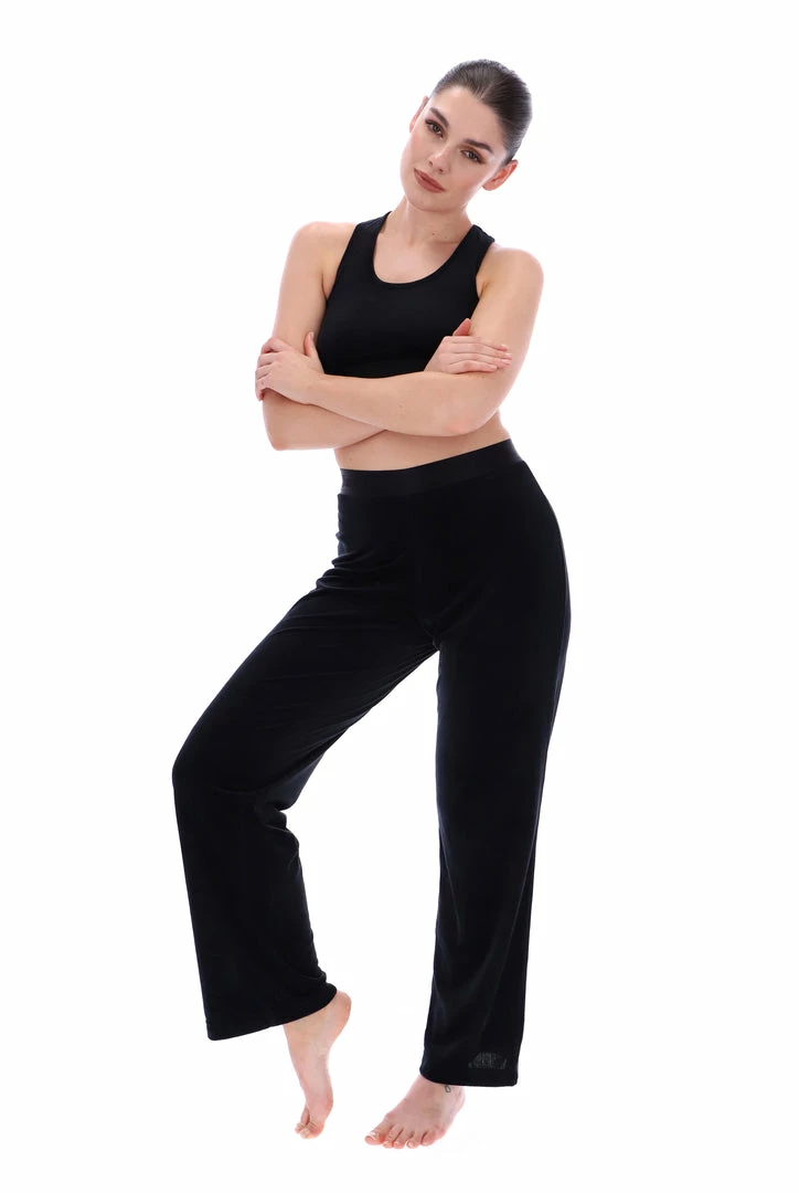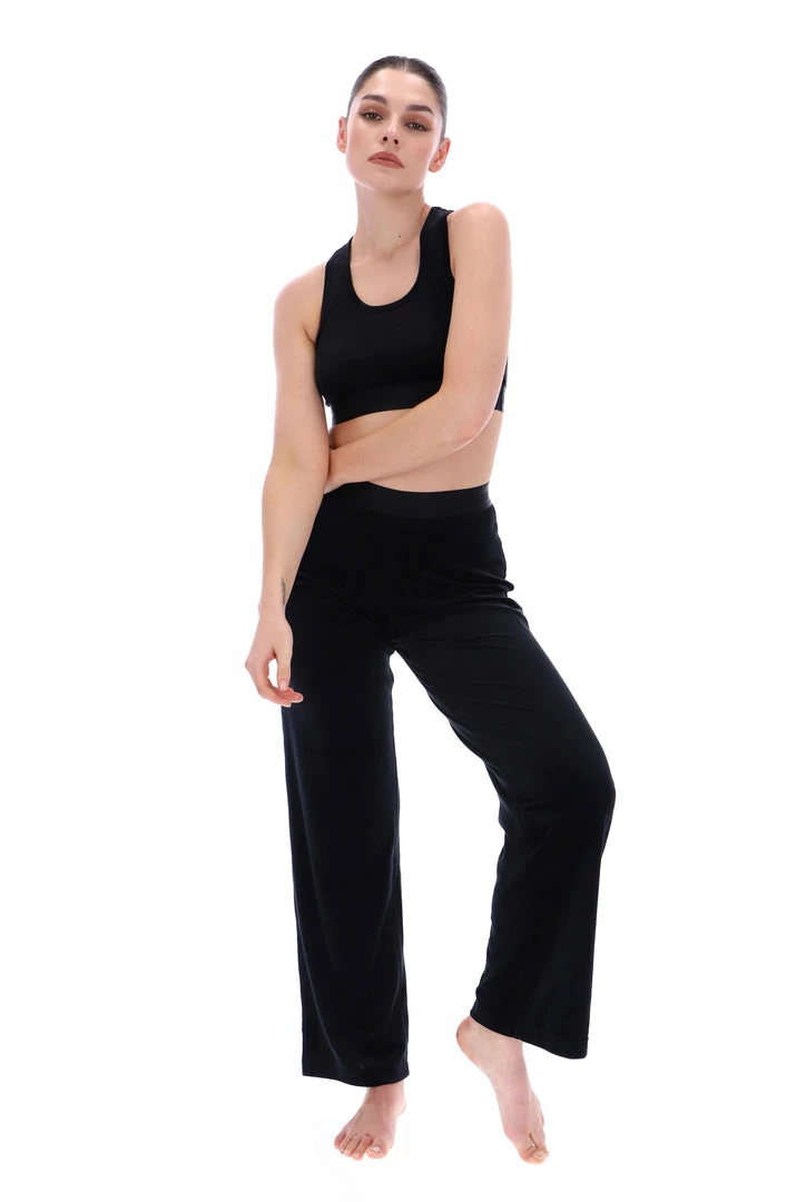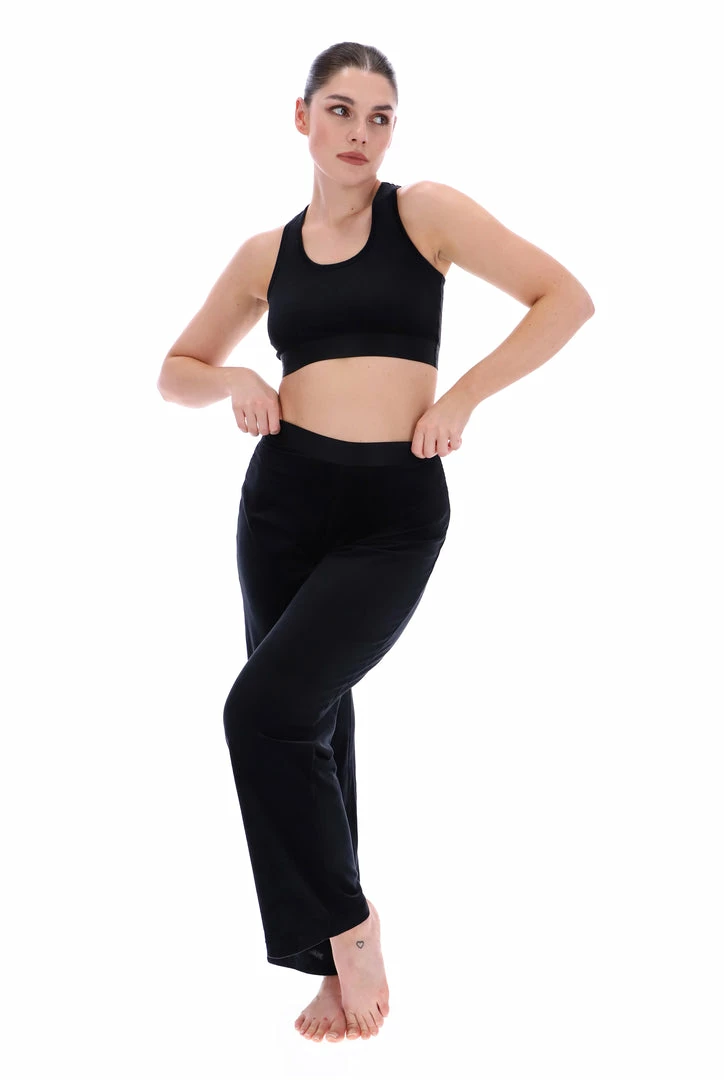 Wide leg bottoms in black ribbed velour. These bottoms feature a relaxed fit and are branded with a jacquard tonal elasticated waistband. Pair with the matching bra for a relaxed post workout look.