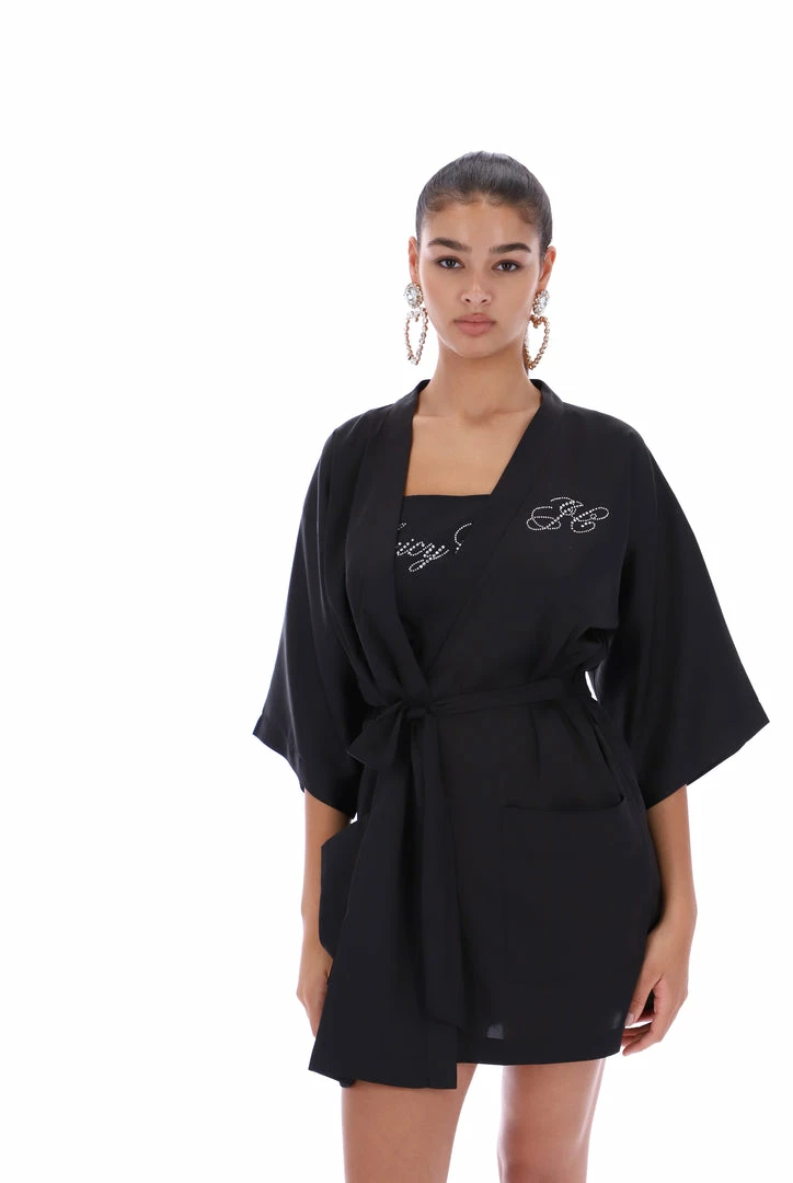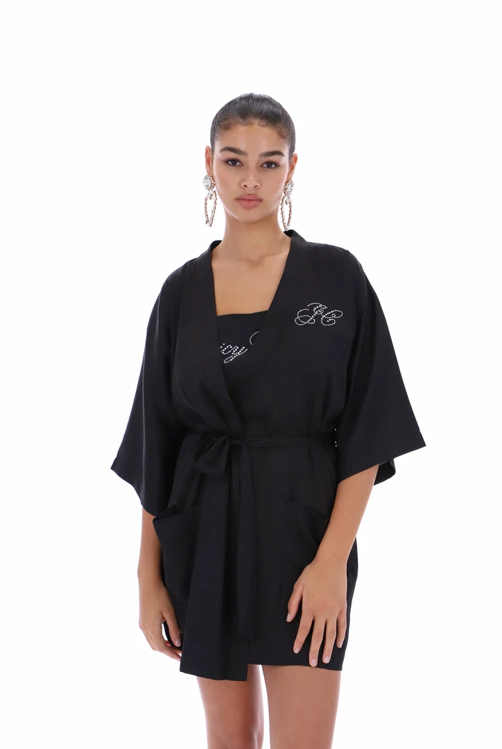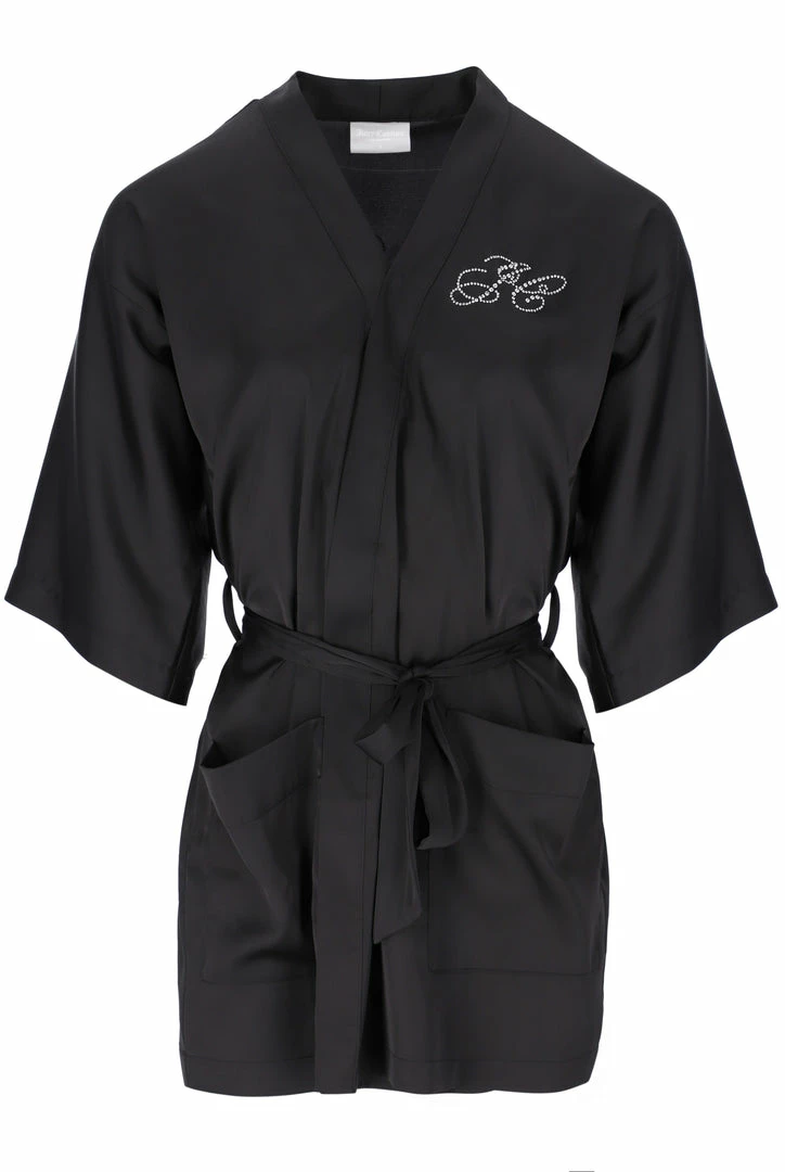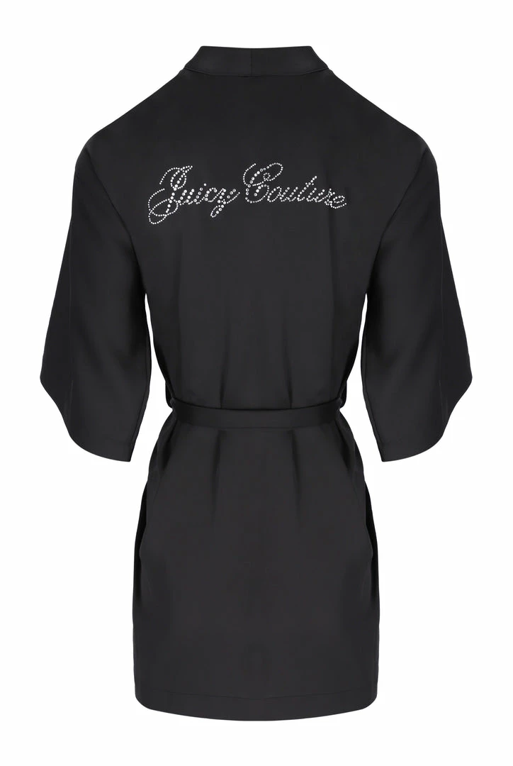 Diamante kimono in black satin. This robe is branded with a diamante ‘Juicy Couture’ logo across the back and embellished with ‘JC’ logo at left chest. Pair with the matching satin kimono for a flirty loungewear look.