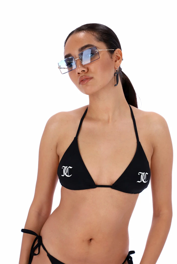 Black two-piece Lycra bikini with logo at cup centre and at back. The triangle halter top features inner removable cups and matte printed JC cheeky logo. The tie-side bottom features matte printed Juicy at back and is adjustable for all body types with the self fabric tie.