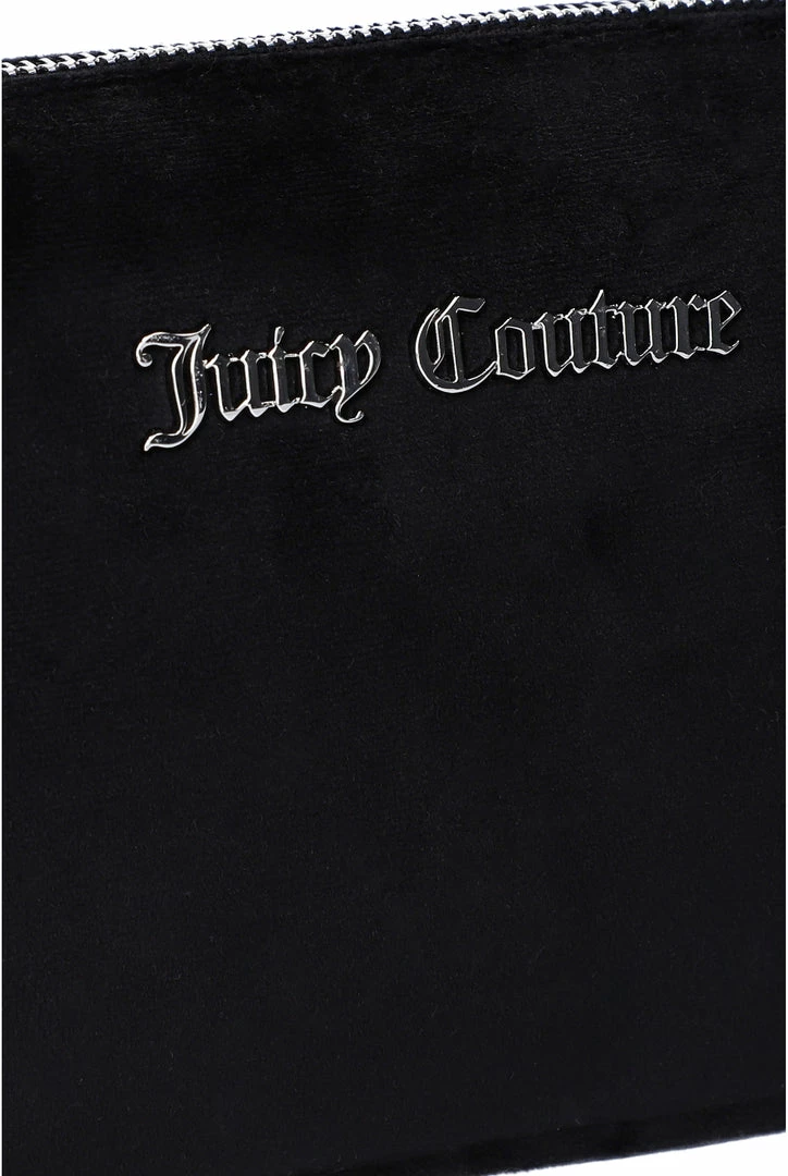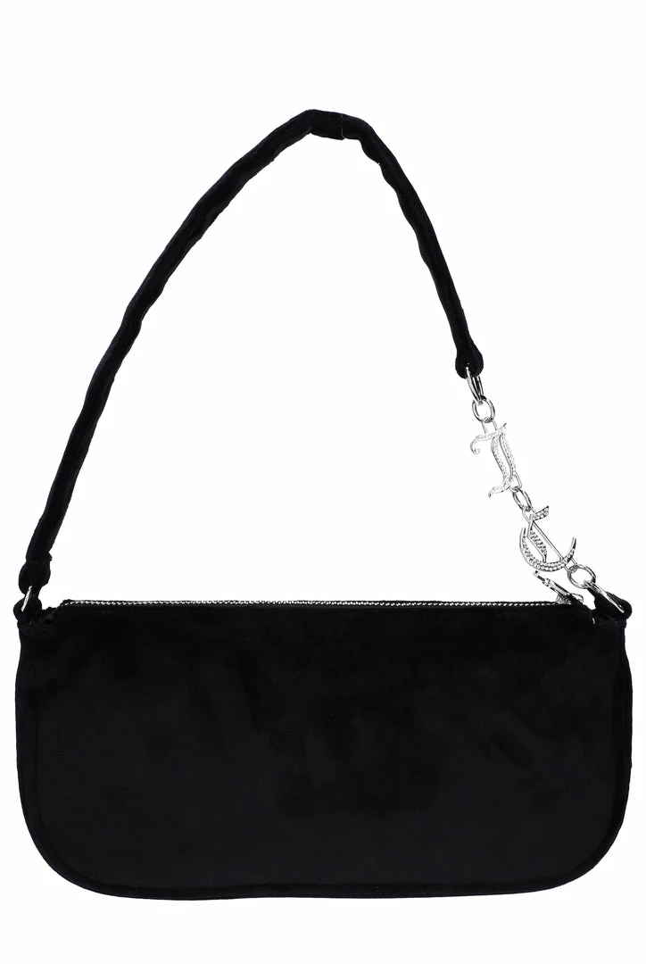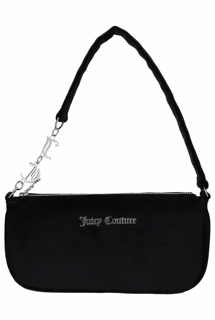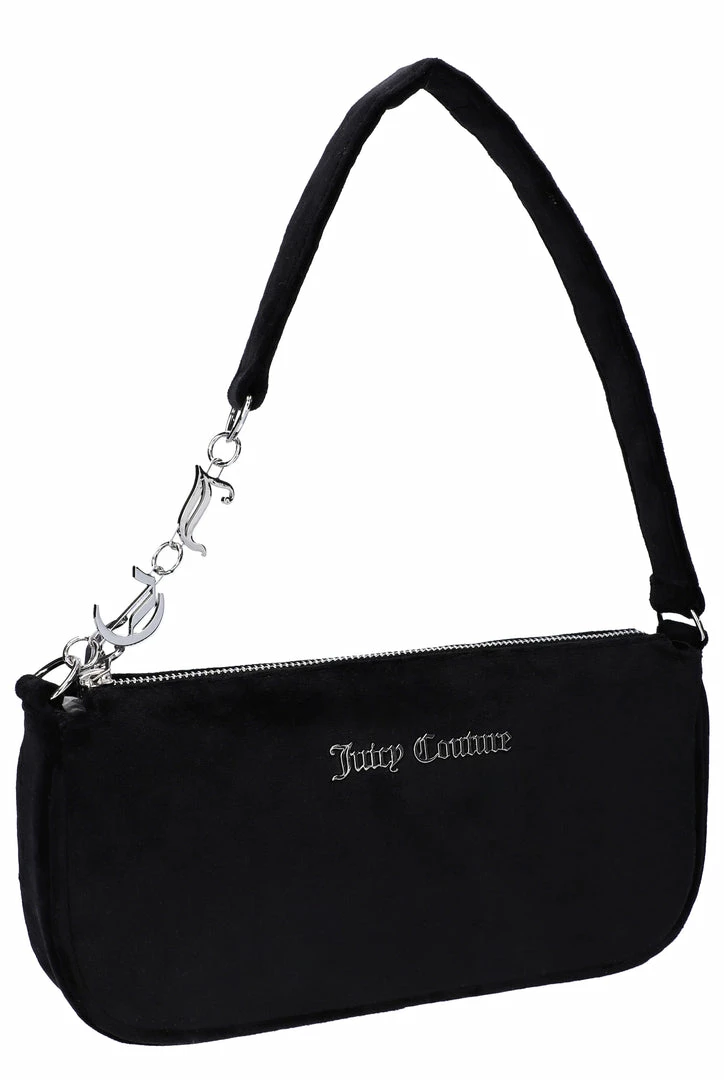 Shoulder bag in black bonded classic velour. This bag features an inside pocket and is branded with a JC linked charm strap detail, ‘Juicy Couture’ logo detailing at the front, and is finished with the signature gothic ‘J’ zip.