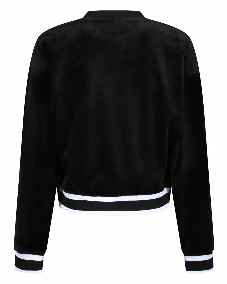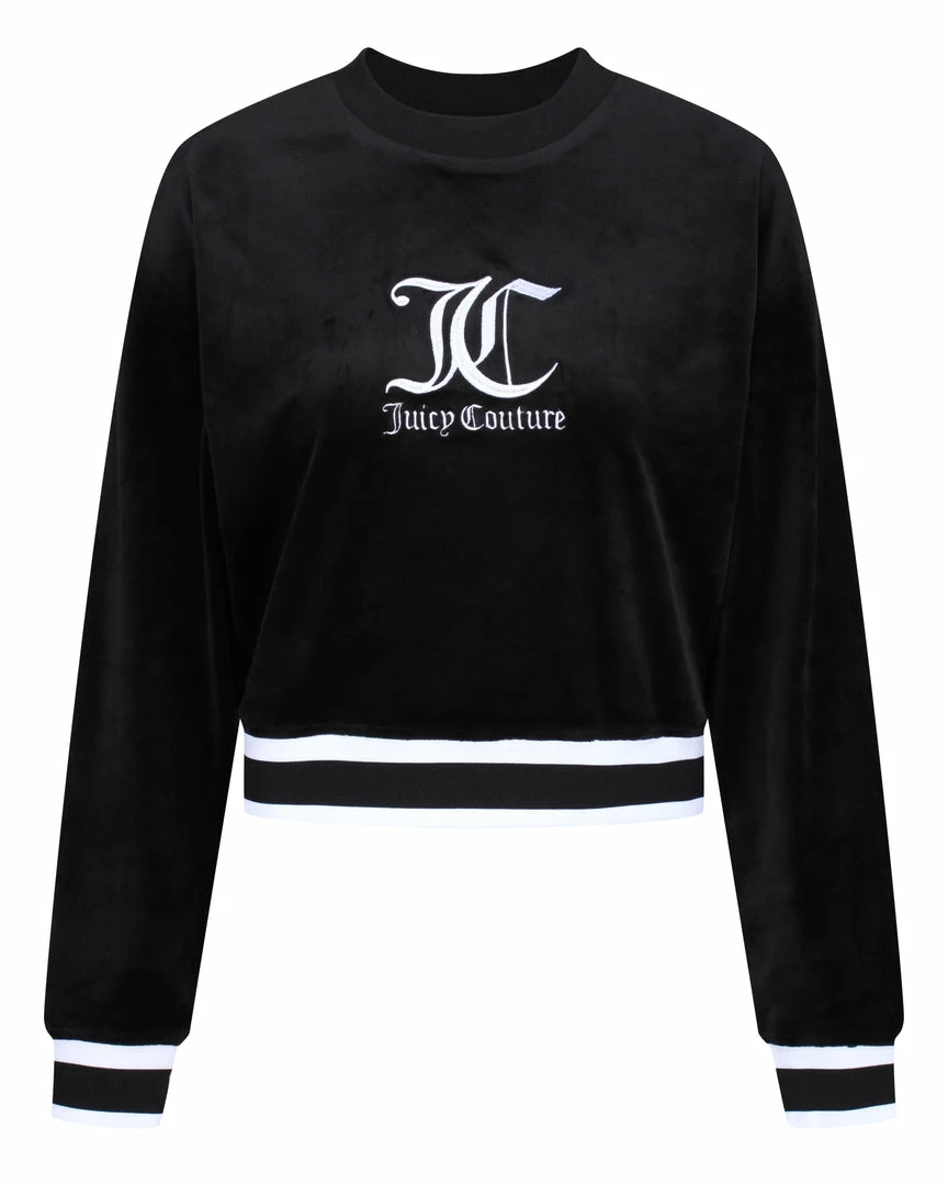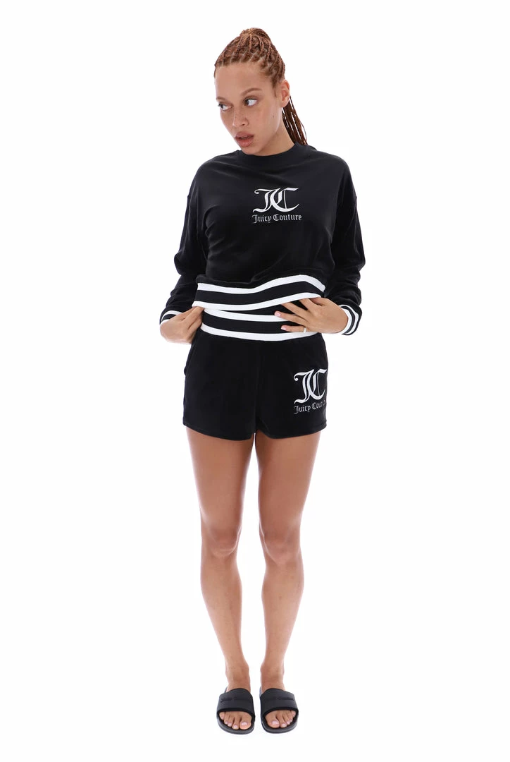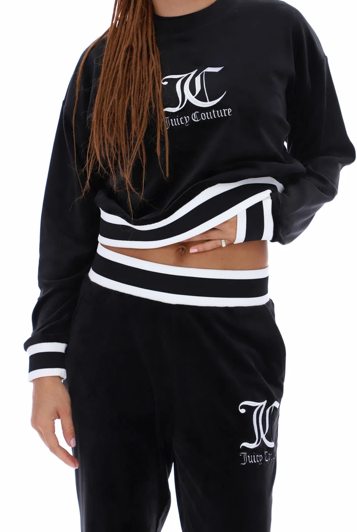 Classic crew neck sweatshirt in black velour. This sweatshirt features a contrast jacquard flat knit rib and is branded with an embroidered stacked logo at chest. Complete the set with the matching shorts and joggers.