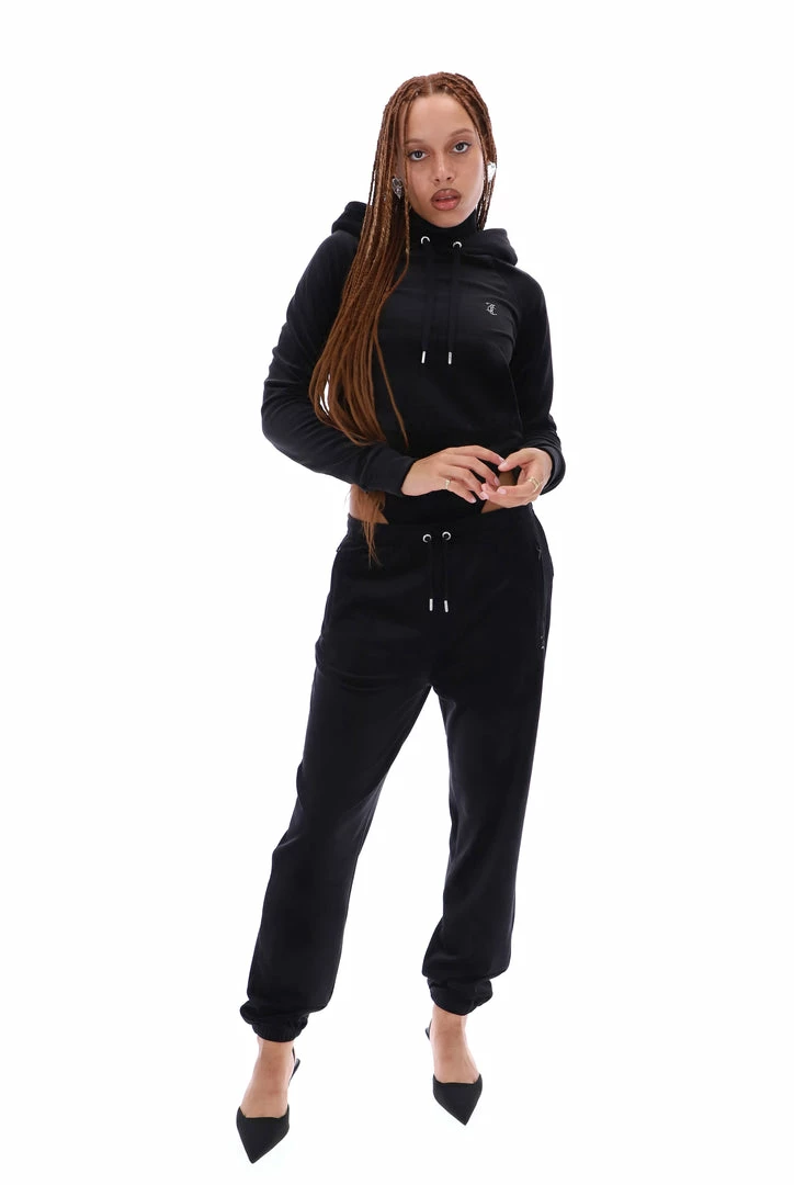 Slim-fit diamante embellished hoodie in black classic velour. This pullover hoodie features a front kangaroo pocket, statement iridescent diamante branding at back and is finished with silver branded hardware.