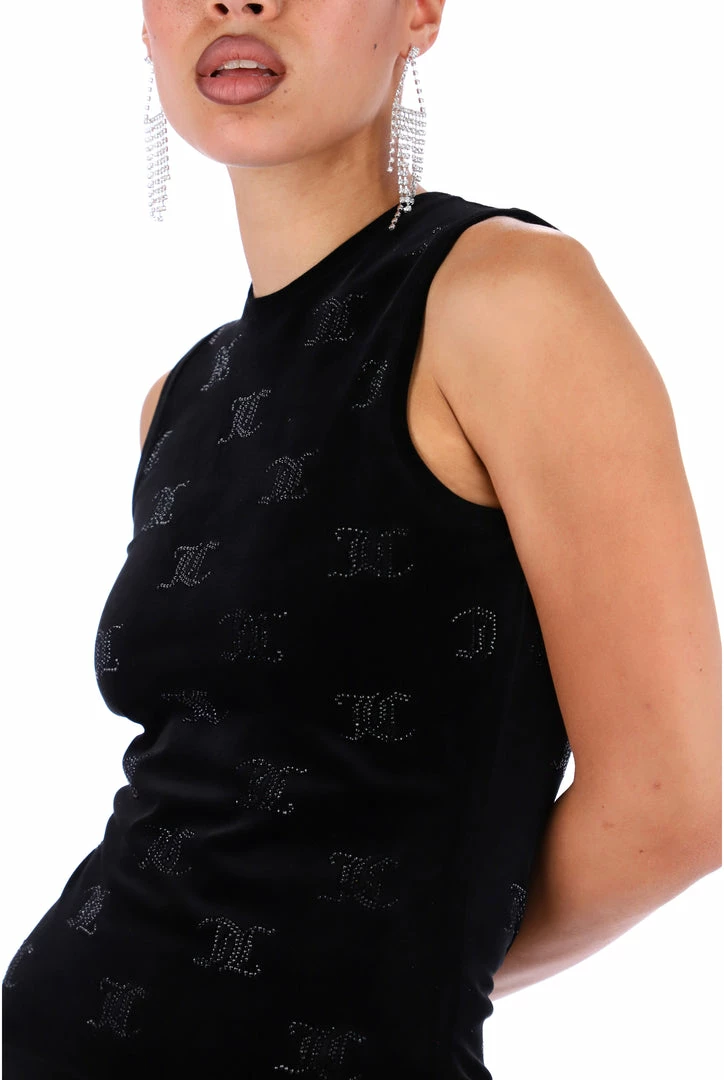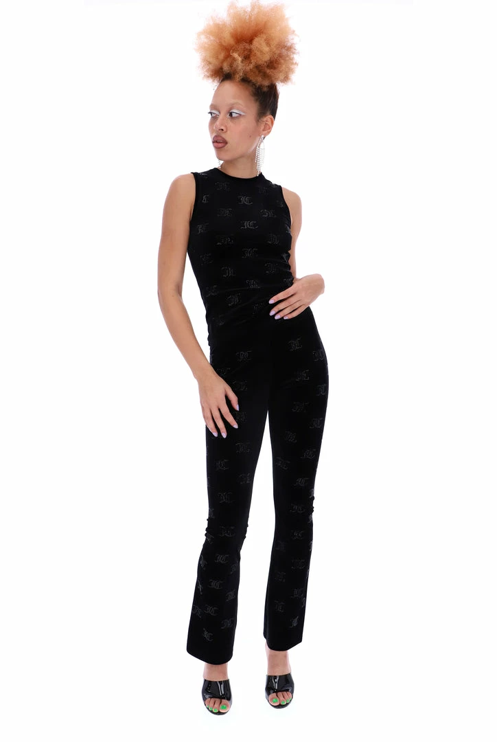Bodycon sleeveless tank top in black ultra velour. This fitted top features an all-over JC monogram iridescent charcoal jet diamante embellishment. Sculpted to the figure, pair with the monogram embellished matching flared pants for a velour evening look.
