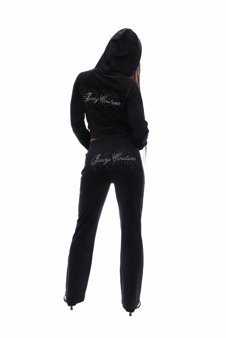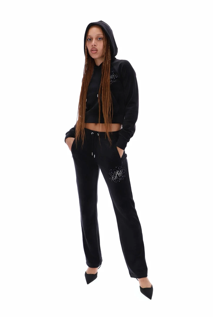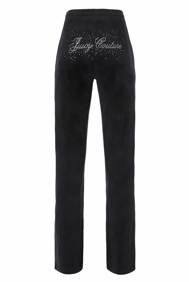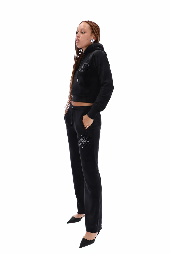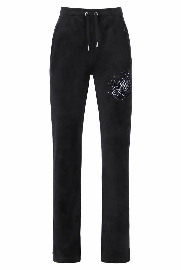 Straight leg diamante embellished tracksuit bottoms in black classic velour. Mid-rise fit, with adjustable drawstring waist and pin tucks through front leg. These bottoms feature zip pockets, script JC diamante branding at hip, statement Juicy Couture script crystal diamante branding on the back and silver branded hardware.