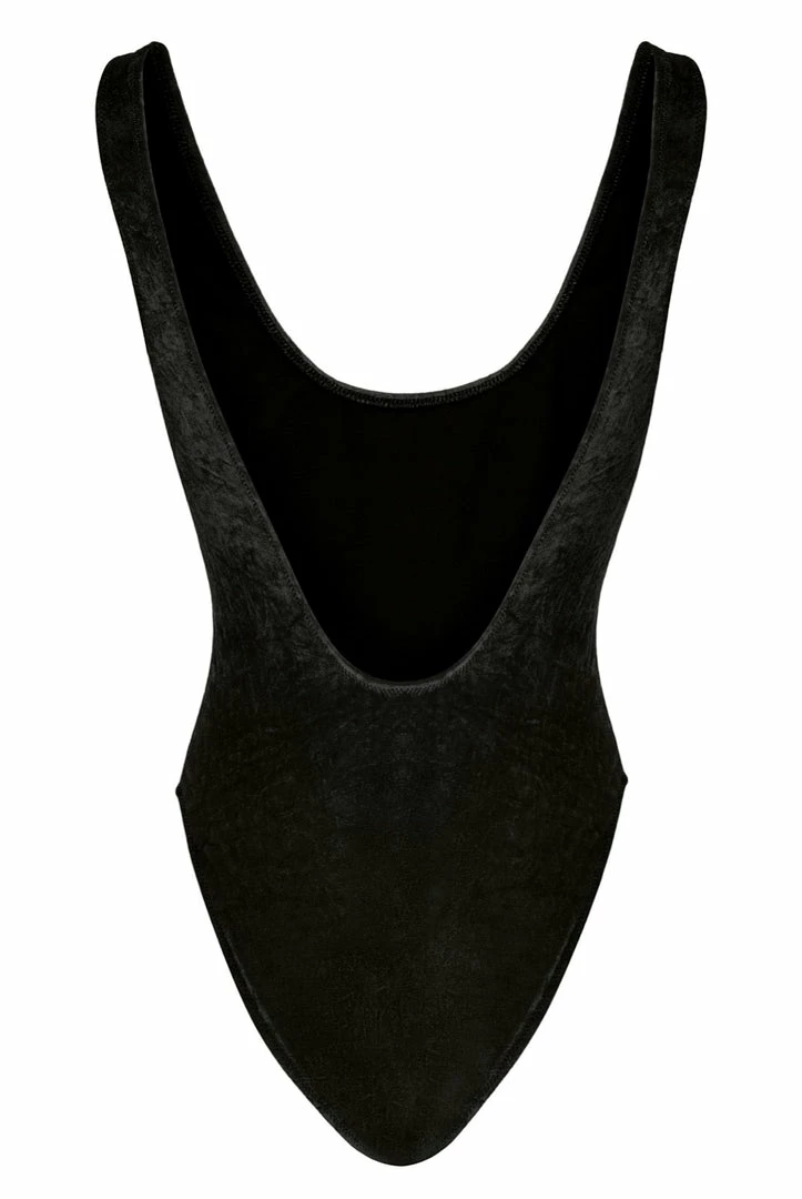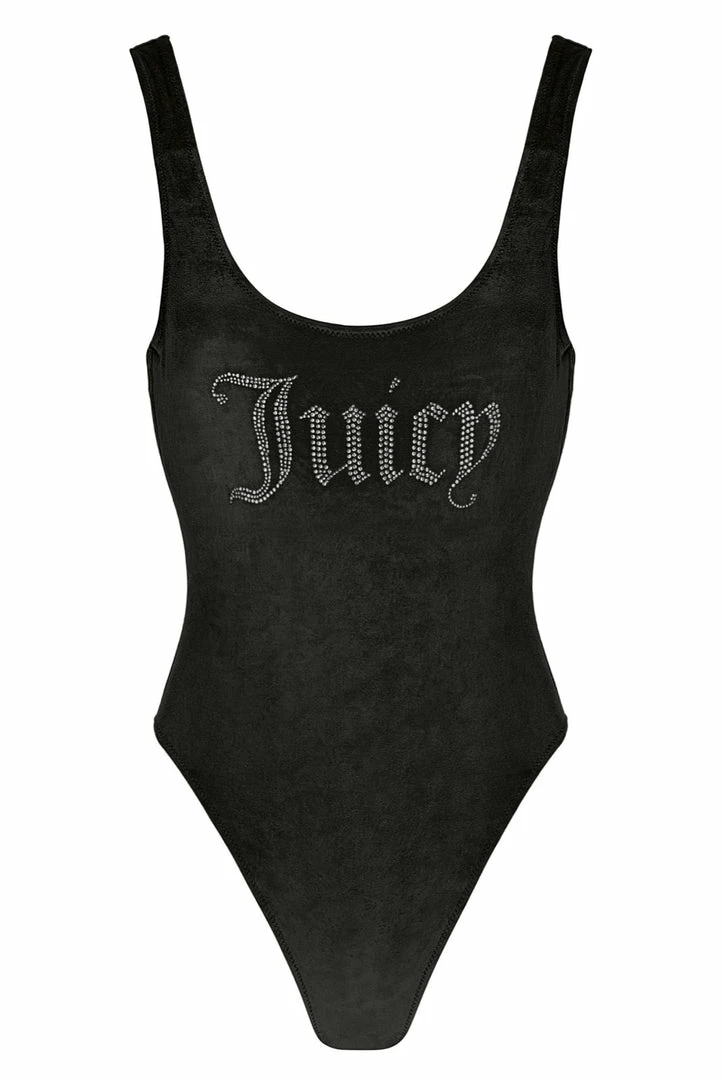 One piece swimsuit in black velvet. This swimsuit features a high cut leg, low scoop front and a deep scoop back. Branded with a statement diamond ‘Juicy’ logo across chest. This versatile piece can be worn as swim or under your favourite Juicy joggers as a body suit.