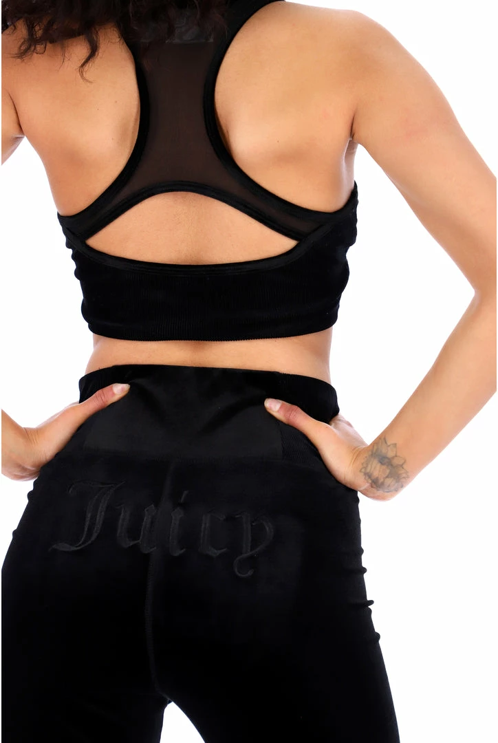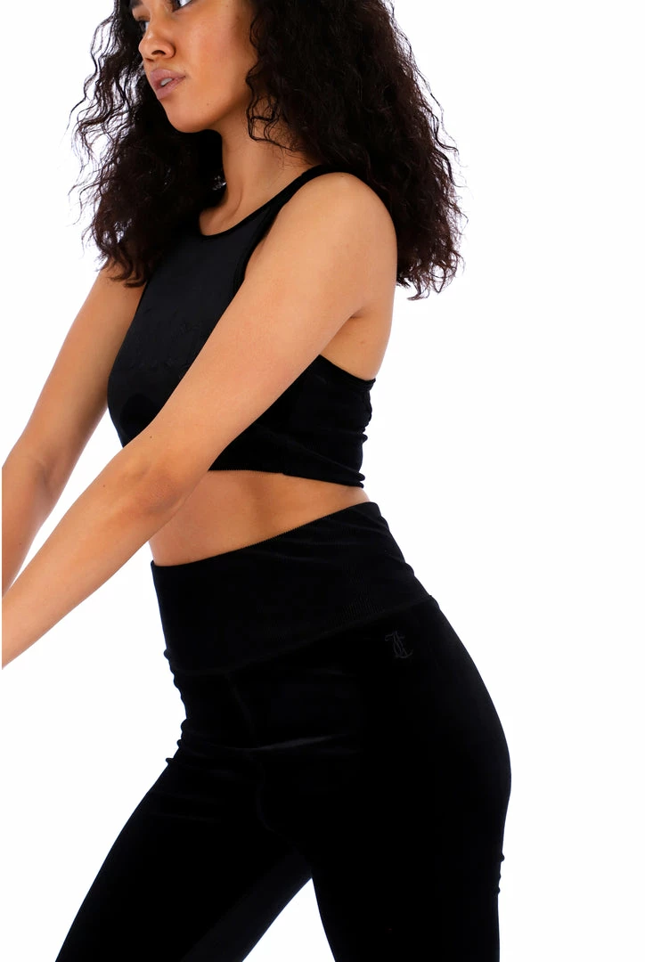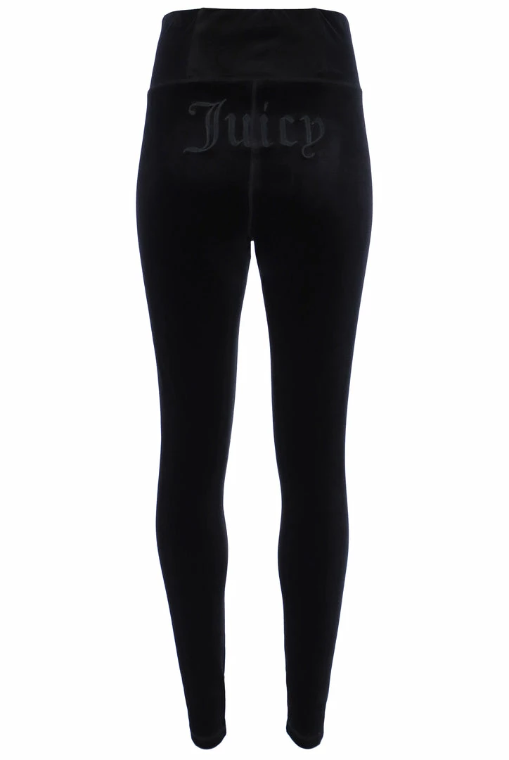High-waisted sport leggings in black velvet. These leggings feature sport style, tonal flatlock stitching for a sculpted fit and are branded with an embroidered Juicy at back and JC at hip. A deep ribbed fitted waistband with power mesh lining features a discreet secure pocket at centre back.