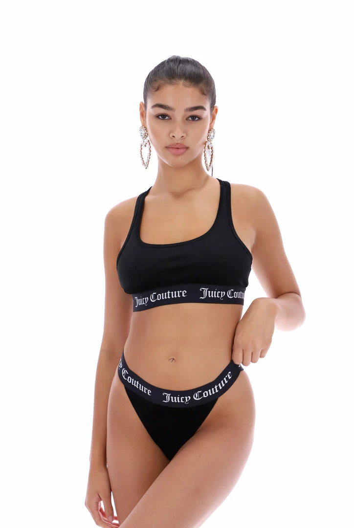 High-cut knicker in black velvet. This bikini brief is branded with a soft jacquard elasticated waistband and can be paired with the matching bra for a full cosy underwear set.