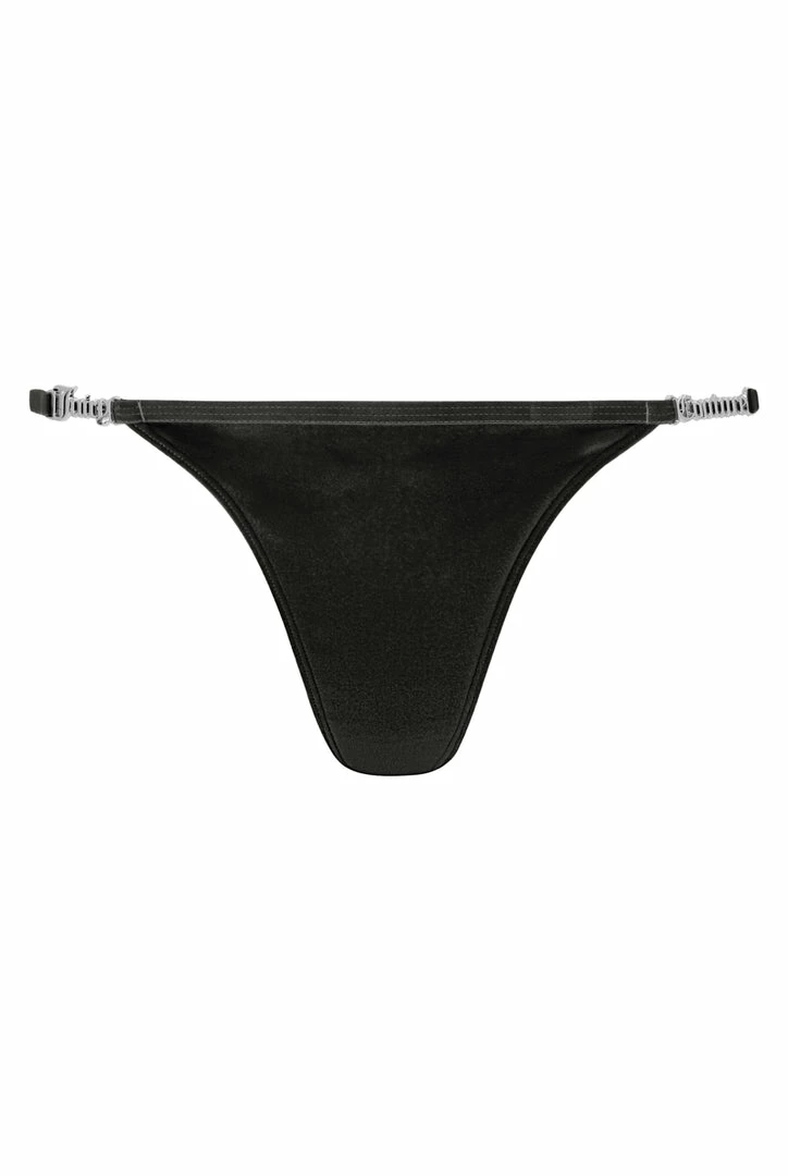 Low rise thong in black velvet. This classic underwear style gets a sexy update with a barely-there string feature. Sitting at the natural hip, this thong can also be worn at wasit with cheeky back coverage. Branded with a silver metal ‘Juicy Couture’ at hips. Pair with the matching triangle bra for a casual flirty look.