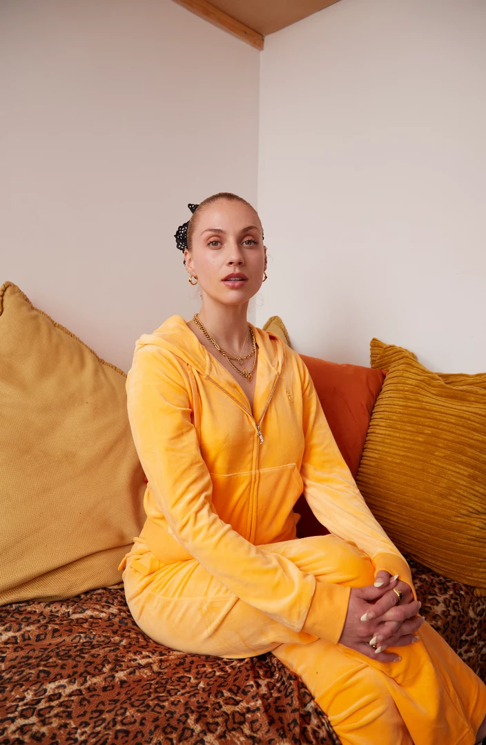 Zip through hoodie in blazing orange classic velour. Slim fit, with kangaroo pockets and a self-fabric lined hood, this core hoodie features a statement gothic J zip pull and is branded with a tonal embroidered JC logo at the chest.