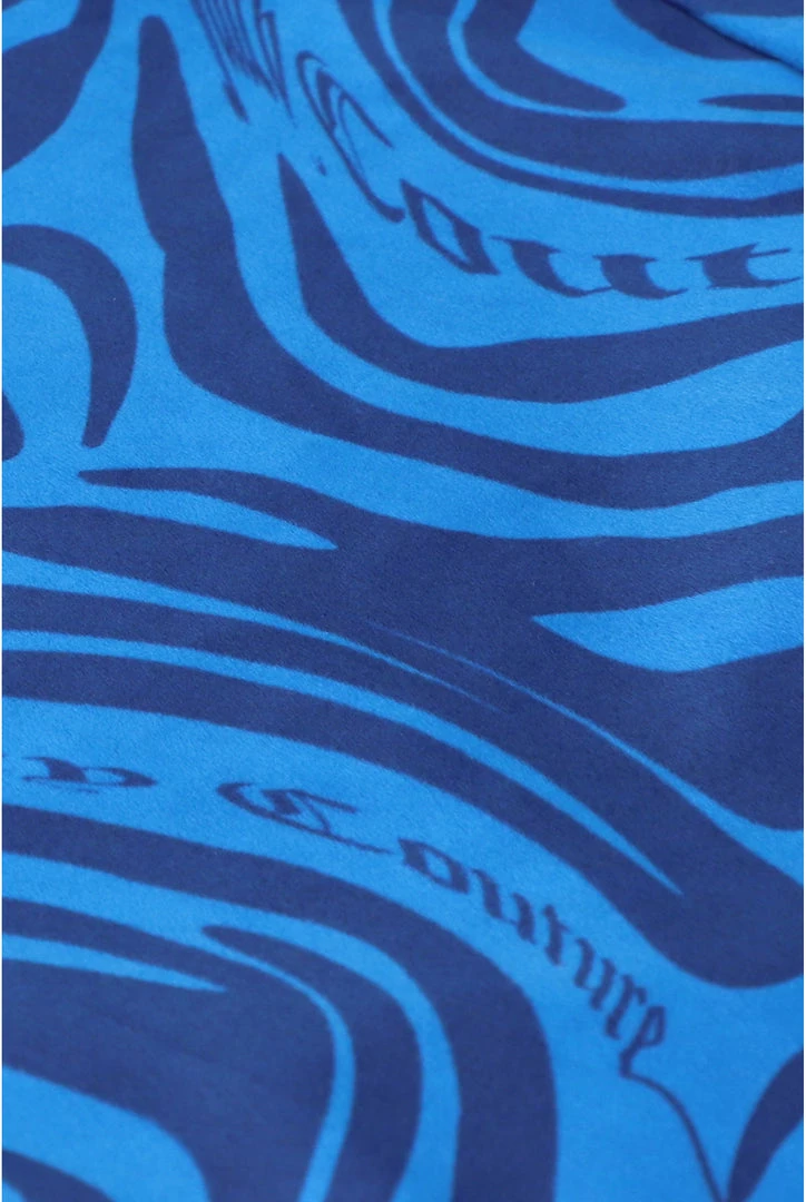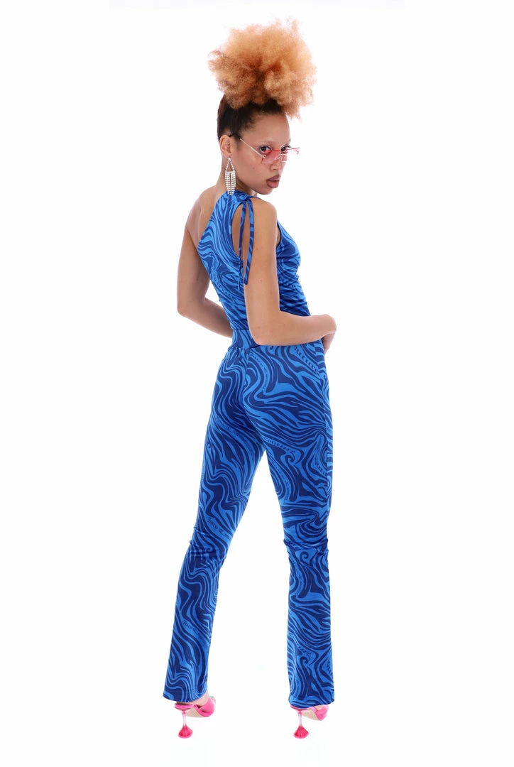 Asymmetric all-over blue wave printed tank in monochrome ultra velour. This bodycon fit top features ruched detailing at shoulder and can be paired with the matching flared pants for a full evening statement look.