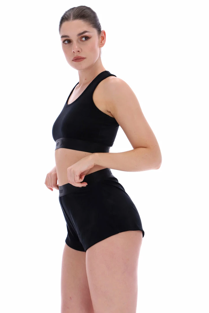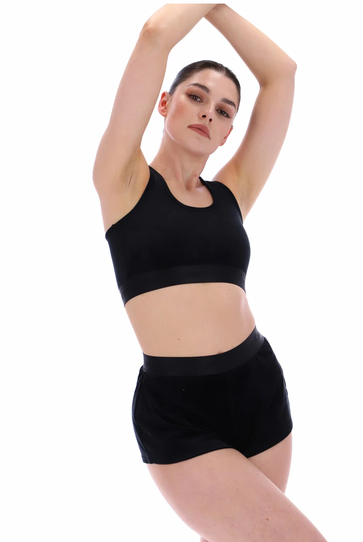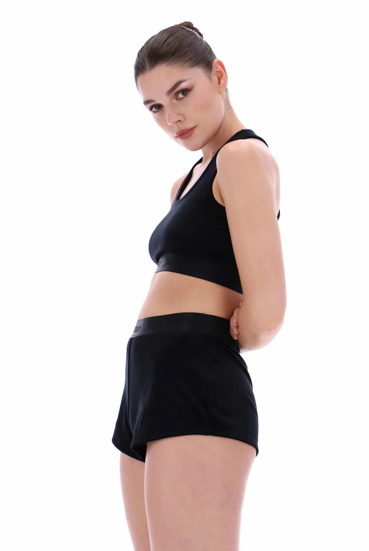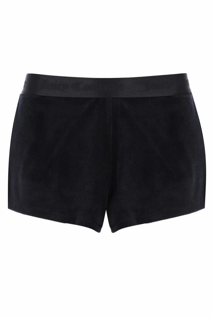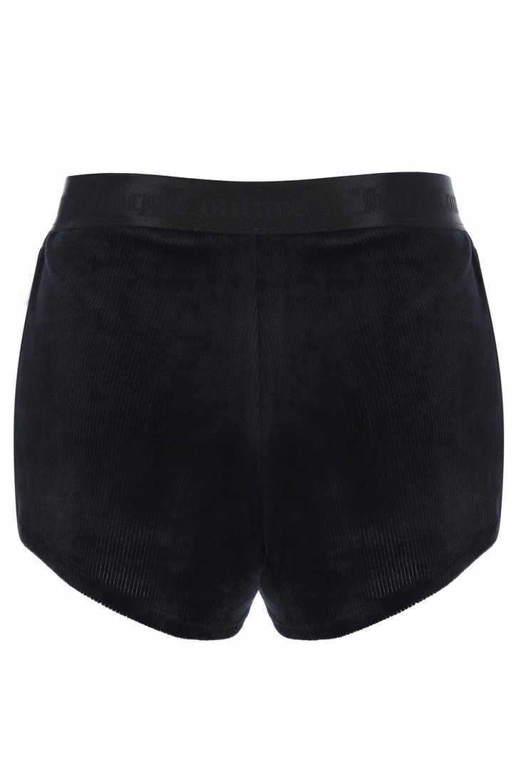 Flared lounge shorts in black ribbed velour. These shorts feature a loose, flirty fit and are branded with a soft jacquard elasticated waistband. Pair with matching racer bra for a relaxed loungewear look.