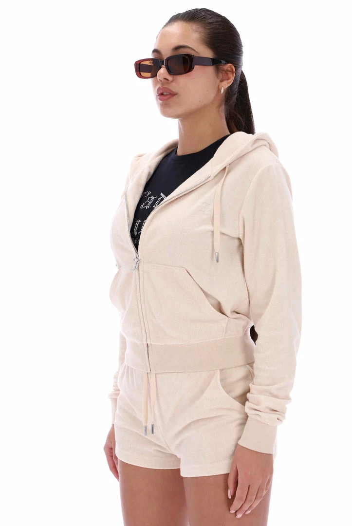 Mid-rise plain shorts in brazilian sand terry towelling. A short flirty fit, with adjustable drawstring ribbed waist and front angled pockets. These iconic core track shorts are branded with silver hardware and a tonal embroidered JC logo at the hip. TERRY TOWELLING- A breathable cotton fabrication to update your staple tracksuit for the summer months. Pair with the matching terry Robertson hoodie for a poolside track fit.