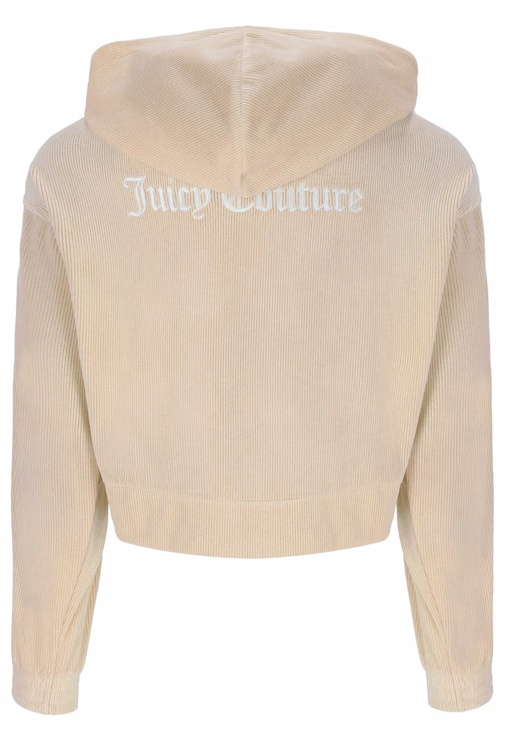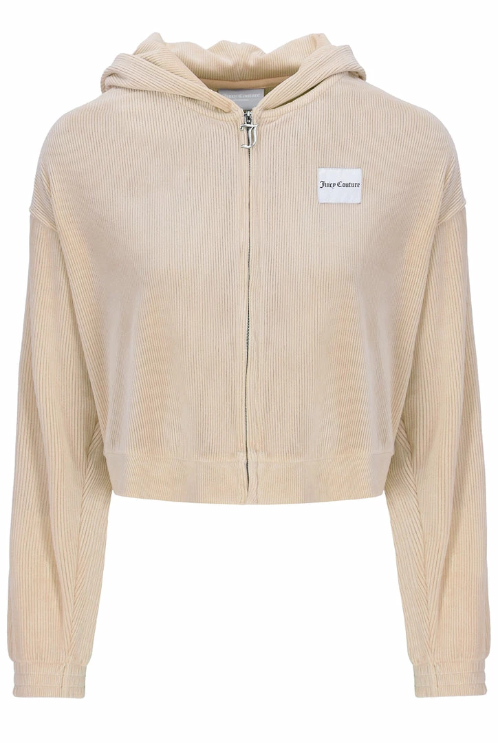 Zip-through hoodie in brazillian sand ribbed velour. This slouchy hoodie is perfect for lounging around, featuring a ‘Juicy Couture’ patch branding at left chest and a tonal embroidered logo across back. Boxy style with a hood, drop shoulders, long sleeves and a zip fastening.