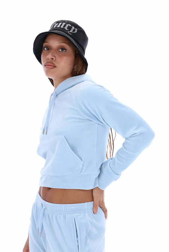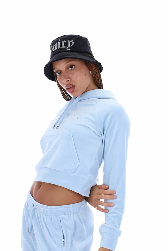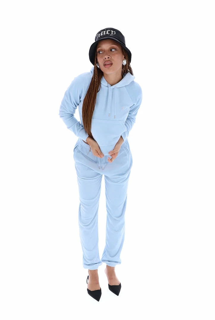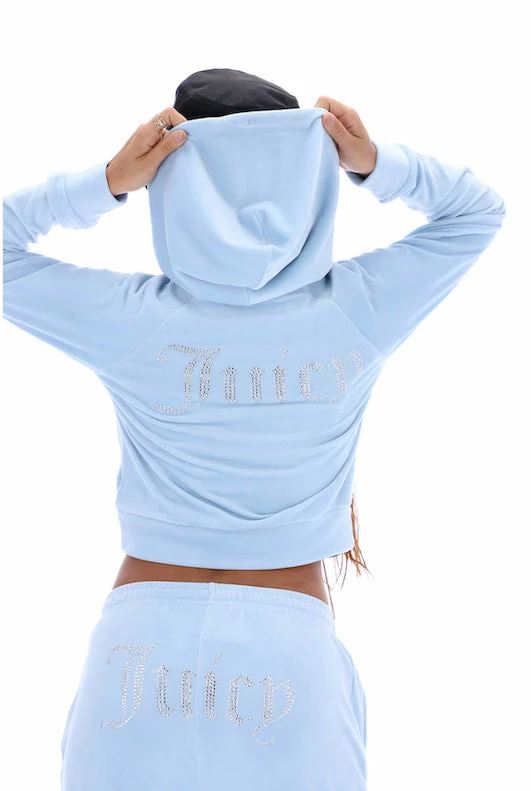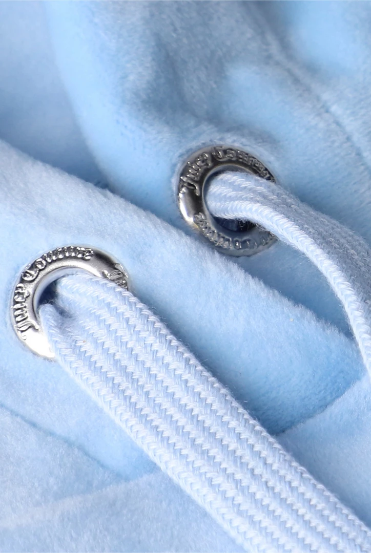 Slim-fit diamante embellished hoodie in cool blue classic velour. This pullover hoodie features a front kangaroo pocket, statement diamante branding at back and is finished with silver branded hardware. Pair with the matching bottoms for a full iconic Juicy Couture tracksuit.