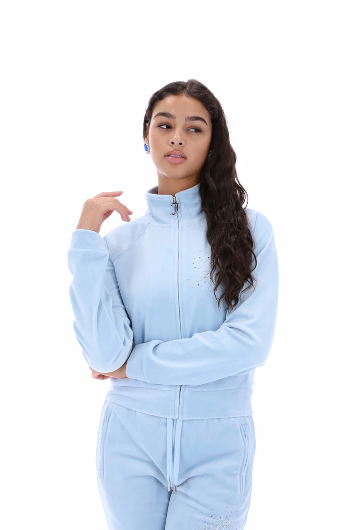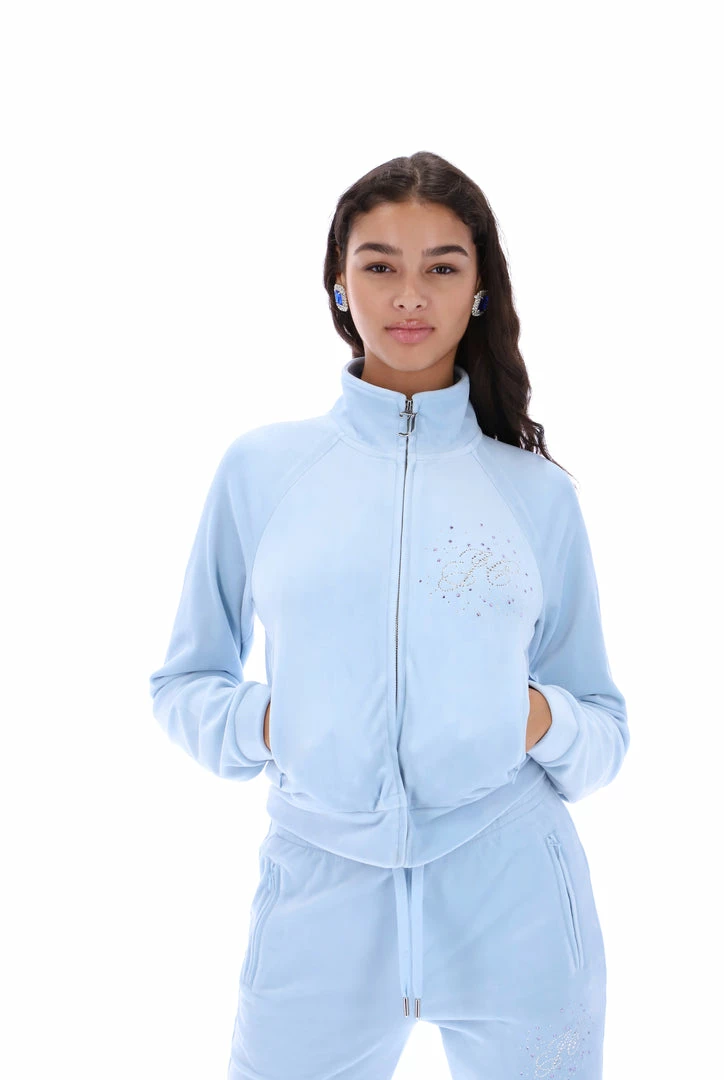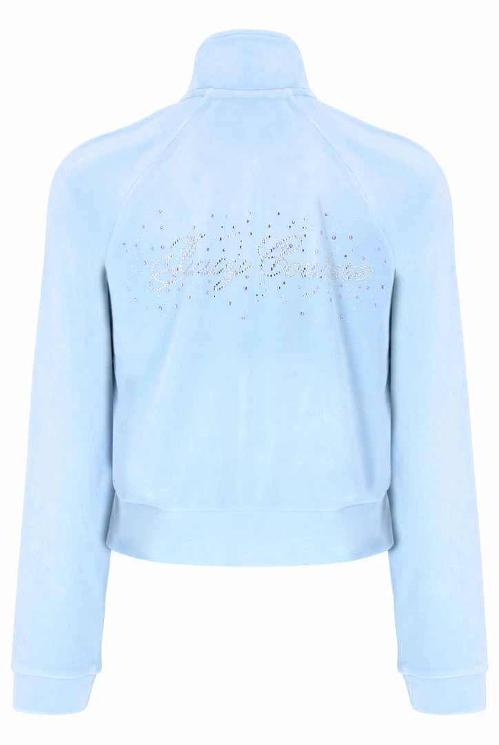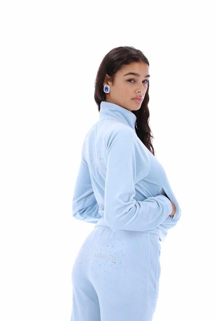 COOL BLUE VELOUR SCRIPT DIAMANTE ZIP UP TRACK TOP