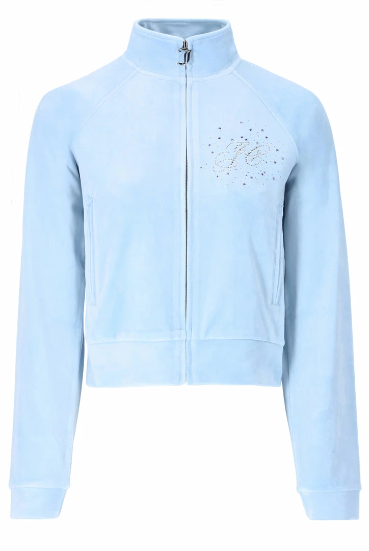 Funnel neck diamante embellished track top in cool blue classic velour. This zip up track top features two side pockets, diamante JC script logo at chest, statement script Juicy Couture diamante branding at back and is finished with silver branded hardware.