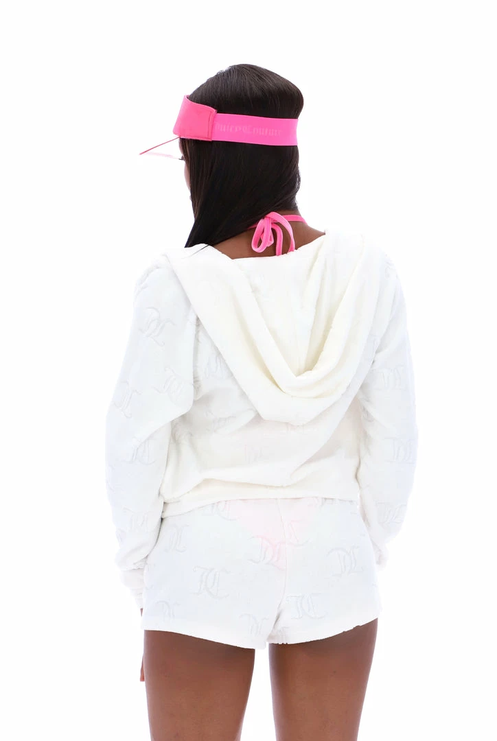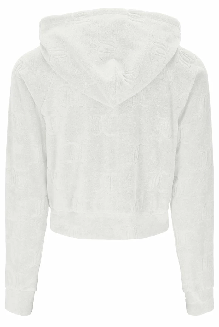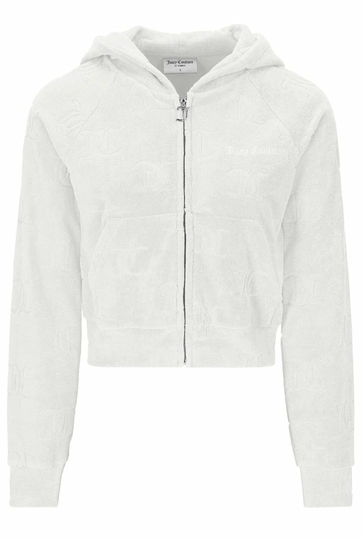 Monogram jacquard hoodie in sugar swizzle recycled terry towelling. Slim fit zip-through hooded tracktop with kangaroo front pockets, self-fabric lined hood and a tonal Juicy Couture’ logo at left chest. Featuring an all over monogram ‘JC’ logo, this hoodie is finished with a silver gothic ‘J’ zip pull. Pair with the matching bottoms to complete the look. RECYCLED TERRY TOWELLING- A breathable cotton fabrication to update your staple tracksuit for the summer months.