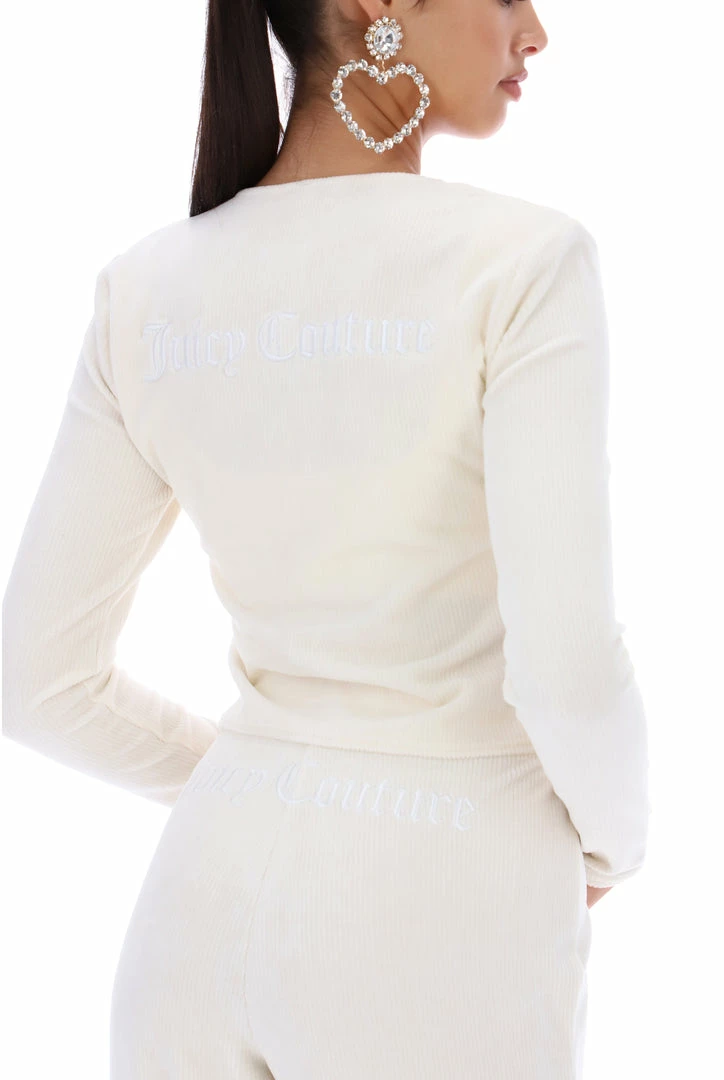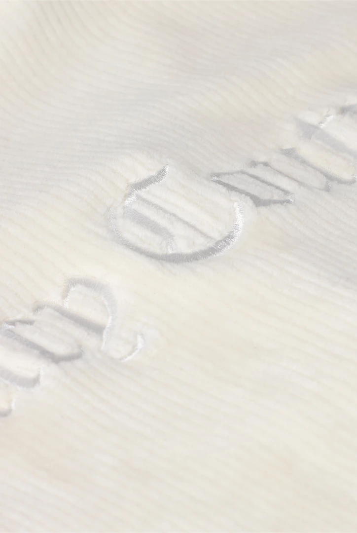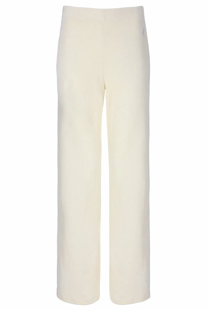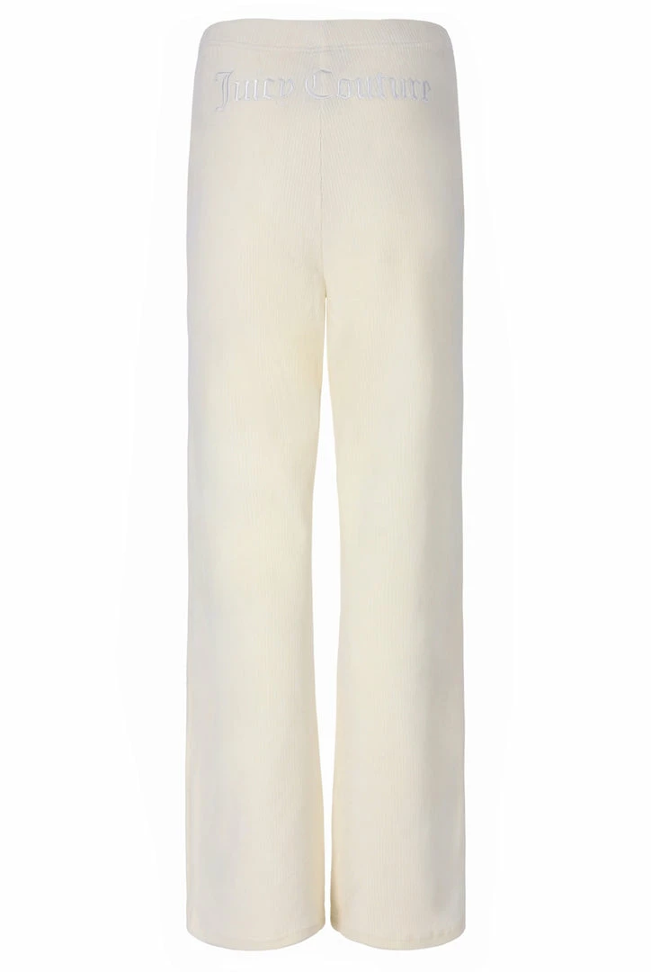 Wide leg high-waisted bottoms in cream rib velour. These relaxed fit bottoms are with Juicy Couture tonal embroidery on back with elasticated waist band. Pair with the matching bralette and cardigan for a complete lounge look.