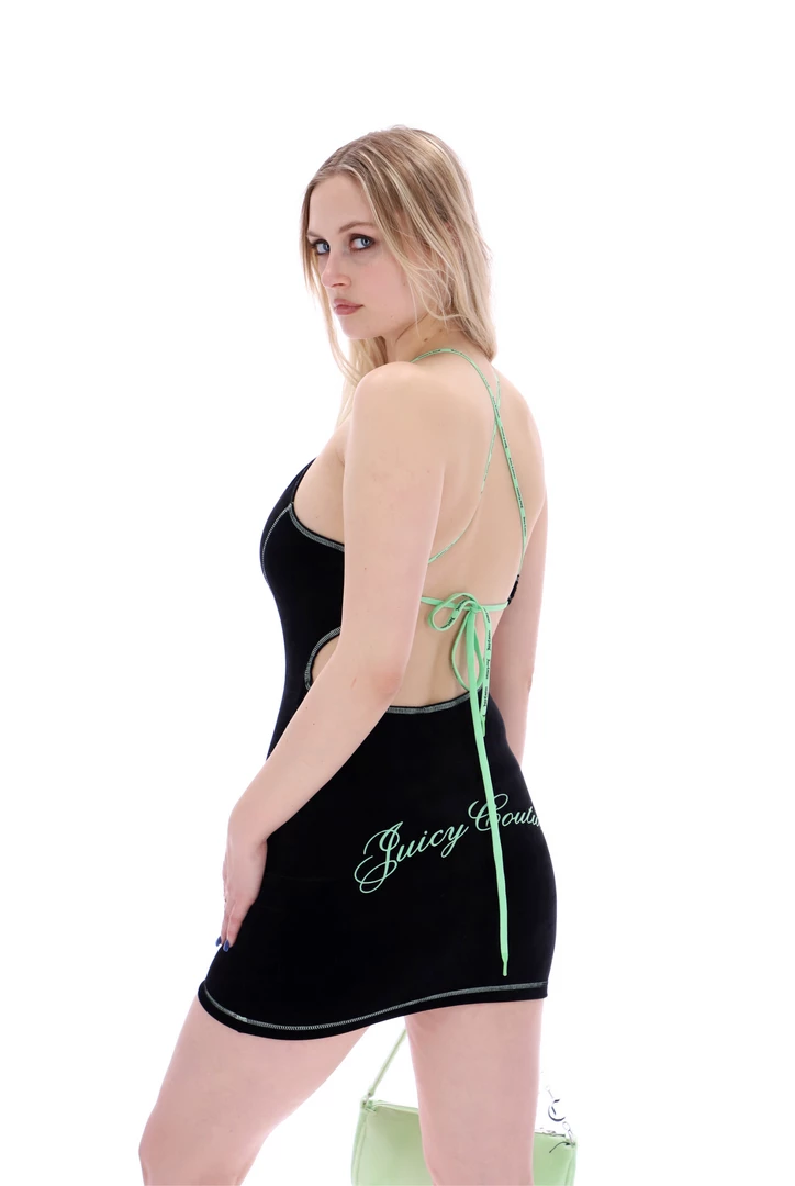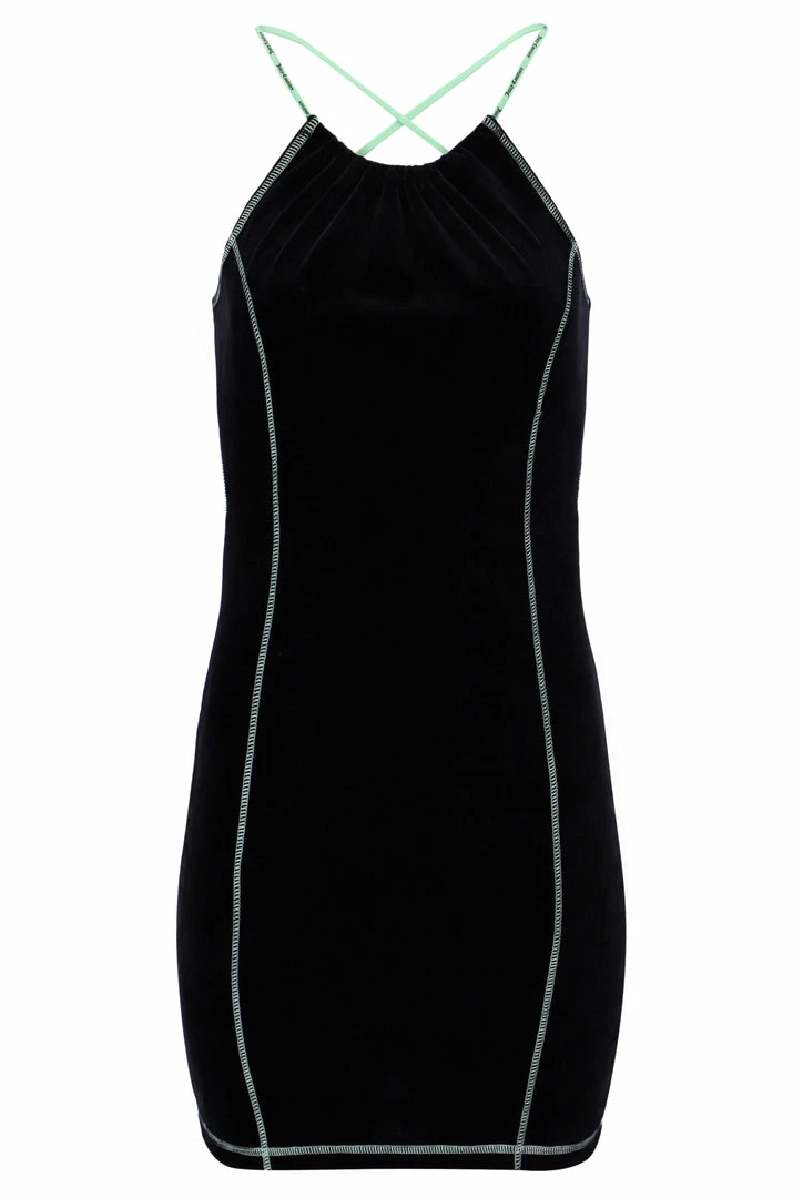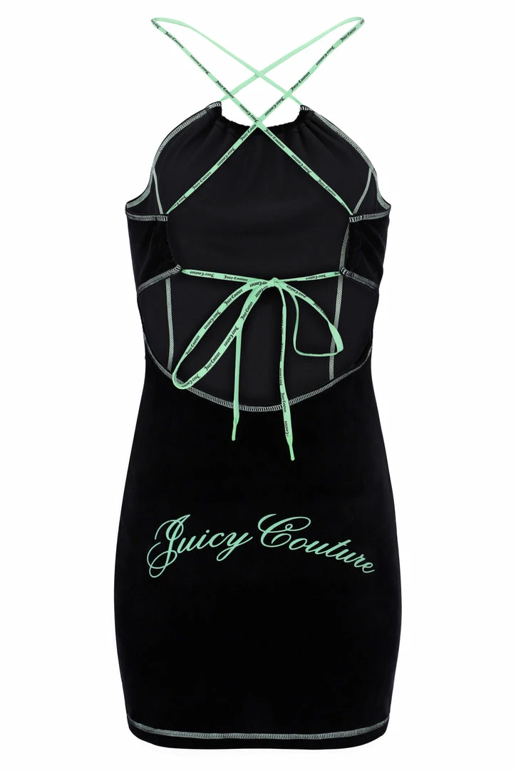 Strap dress in black ultra velour. This halter front dress features a branded mint latice tie back and contrast stitching for a sculpted fit. Branded with a flocked arch script logo.