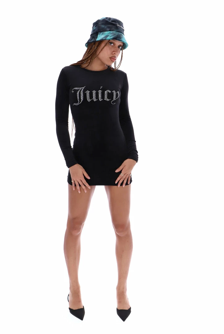 Long-sleeve dress in black classic velour. This fitted crew neck style dress is branded with ‘Juicy’ diamante embellishment across chest.
