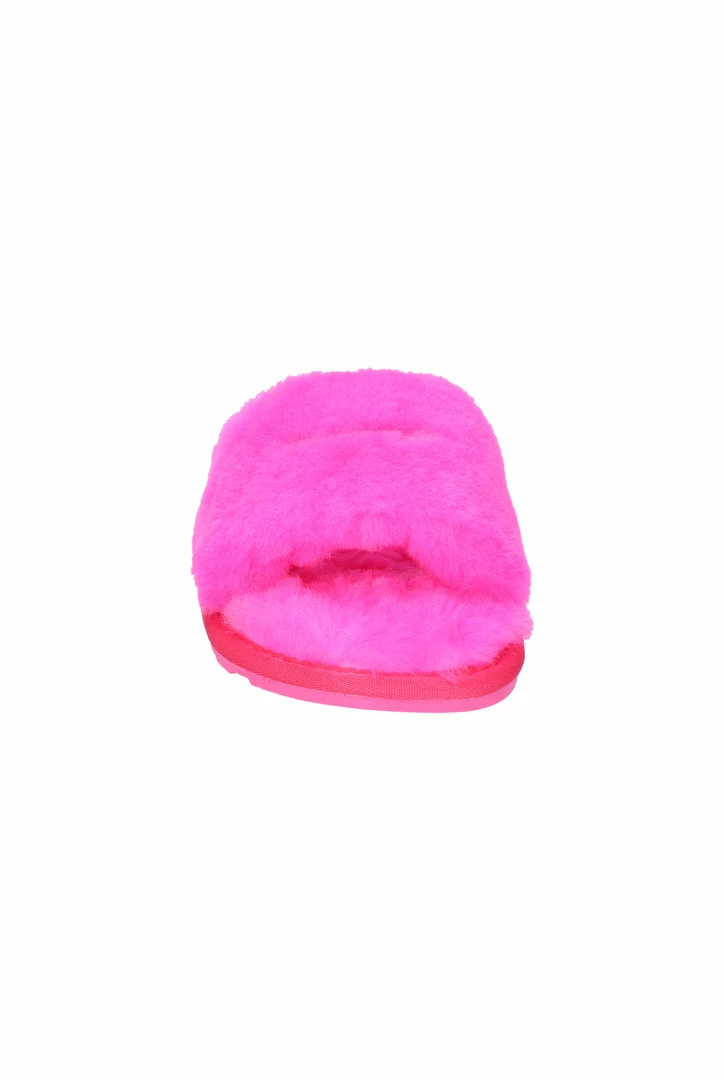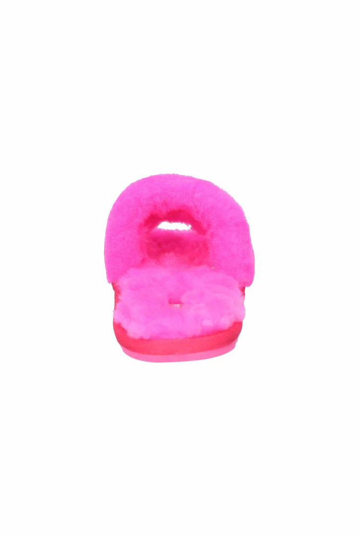 Tonal fur slippers in fluro pink sheepskin. This classic slipper features a branded tread outsole offering a wearable experience inside or outside. These are finished with a branded woven label on footbed and a 3D raised metal logo through upper strap.