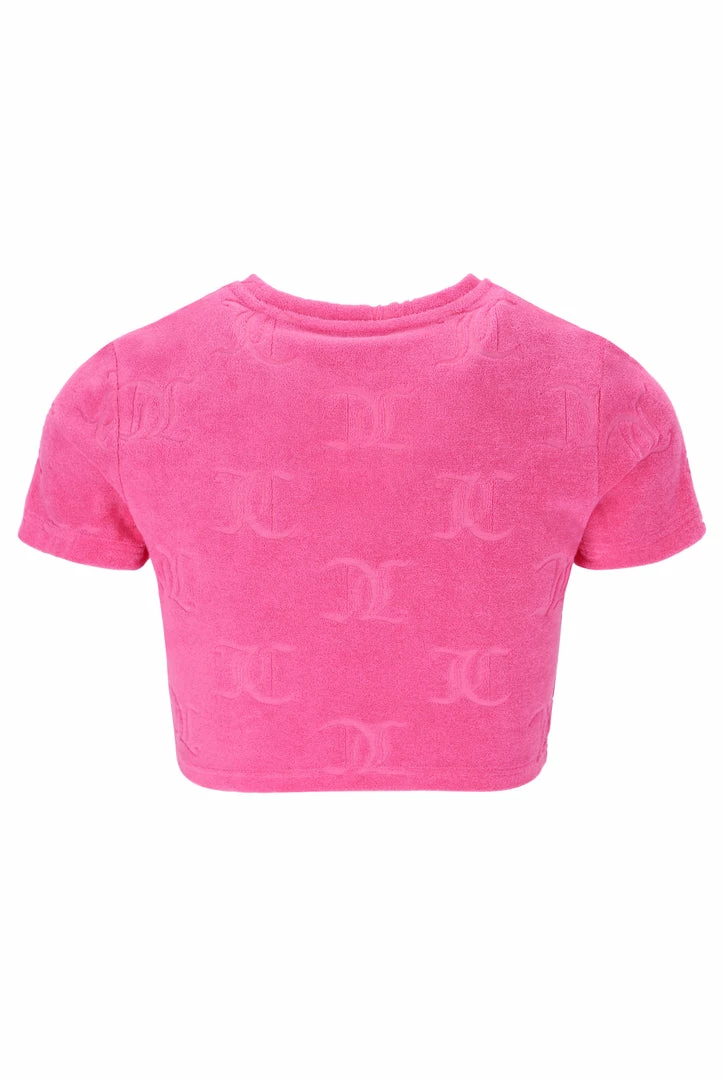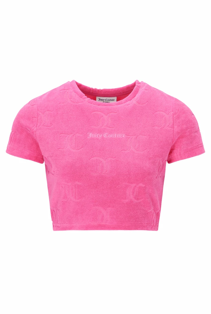 Monogram jacquard cropped t-shirt in fluro pink terry towelling. This cropped fit tee feature an all over monogram jacquard ‘JC’ logo and are finished with a tonal ‘Juicy Couture’ branding at front. RECYCLED TERRY TOWELLING- A breathable cotton fabrication to update your wardrobe for the summer months.