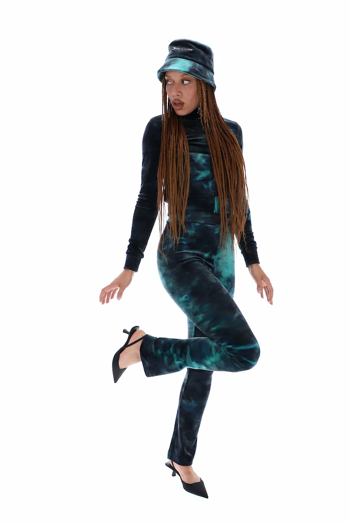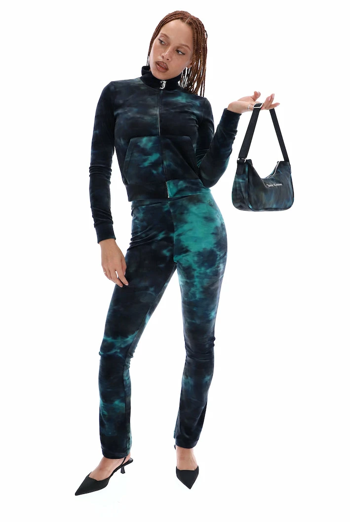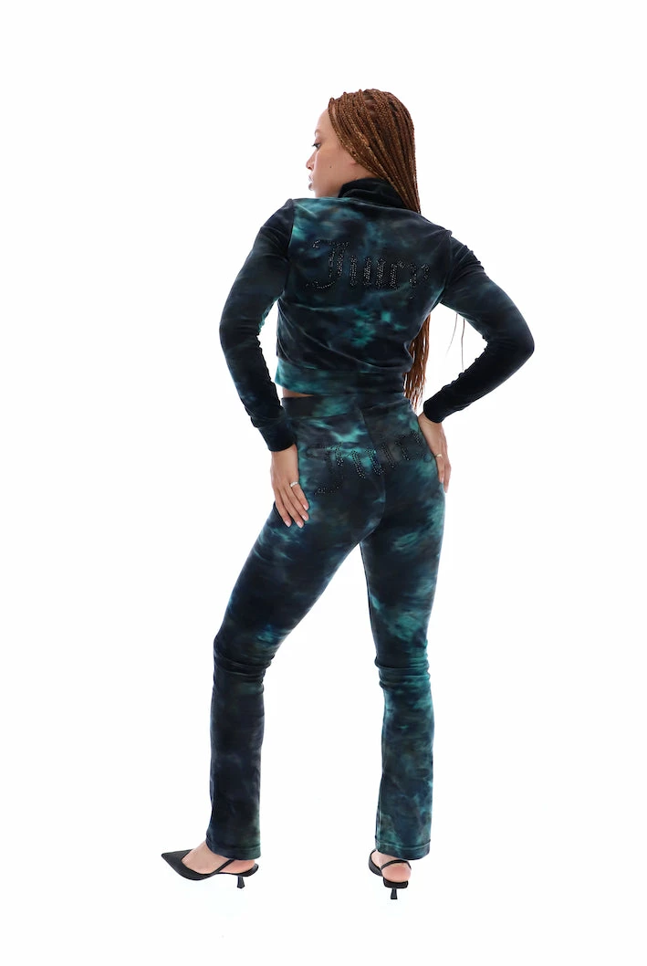 High-waisted diamante embellished flared pants in dynasty green tie dye classic velour. These bottoms feature an encased elasticated waistband and statement diamante Juicy branding across the back. Sculpted to the figure, these pants subtly flare at the ankle for an updated flattering silhouette.