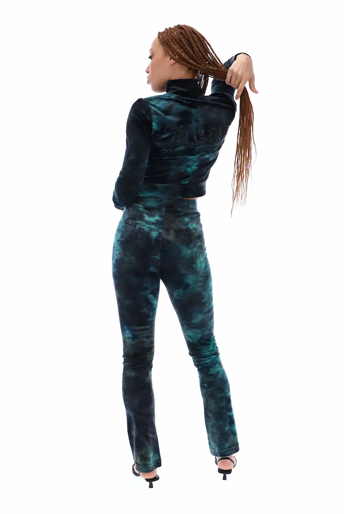 DYNASTY GREEN TIE DYE VELOUR DIAMANTE FLARED PANTS