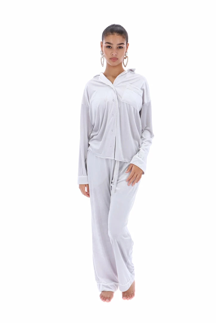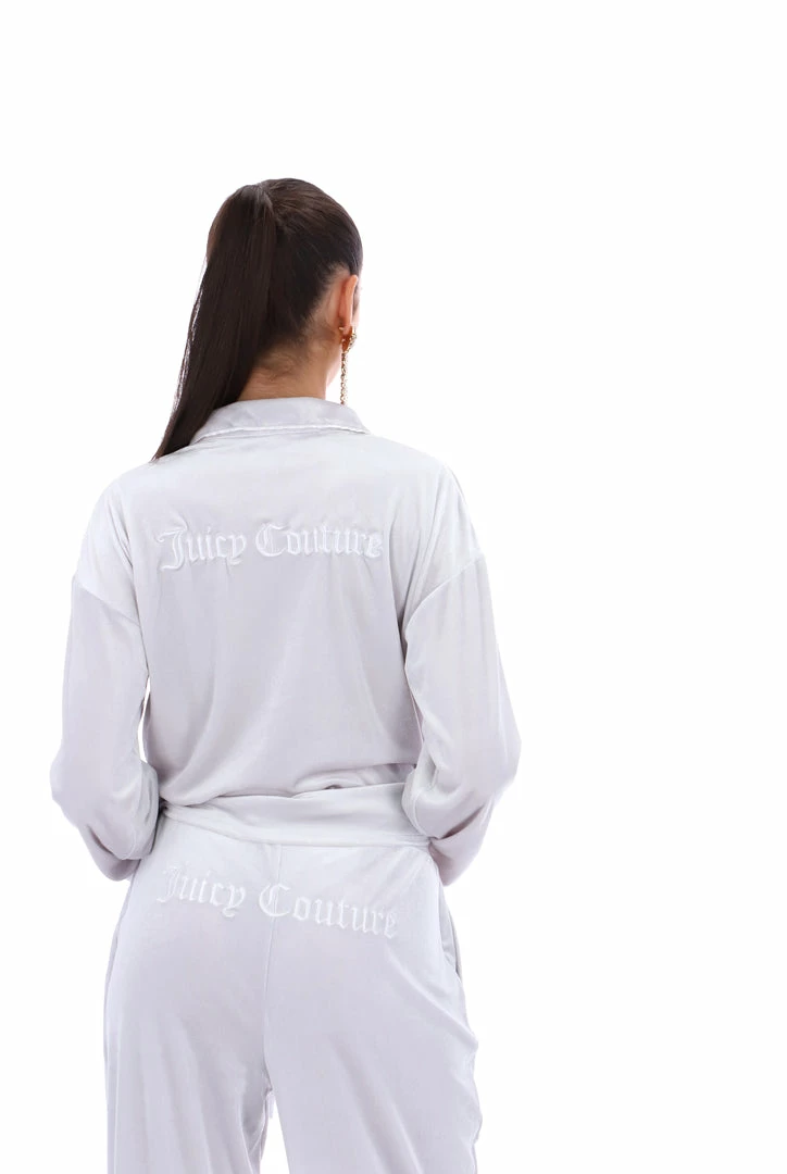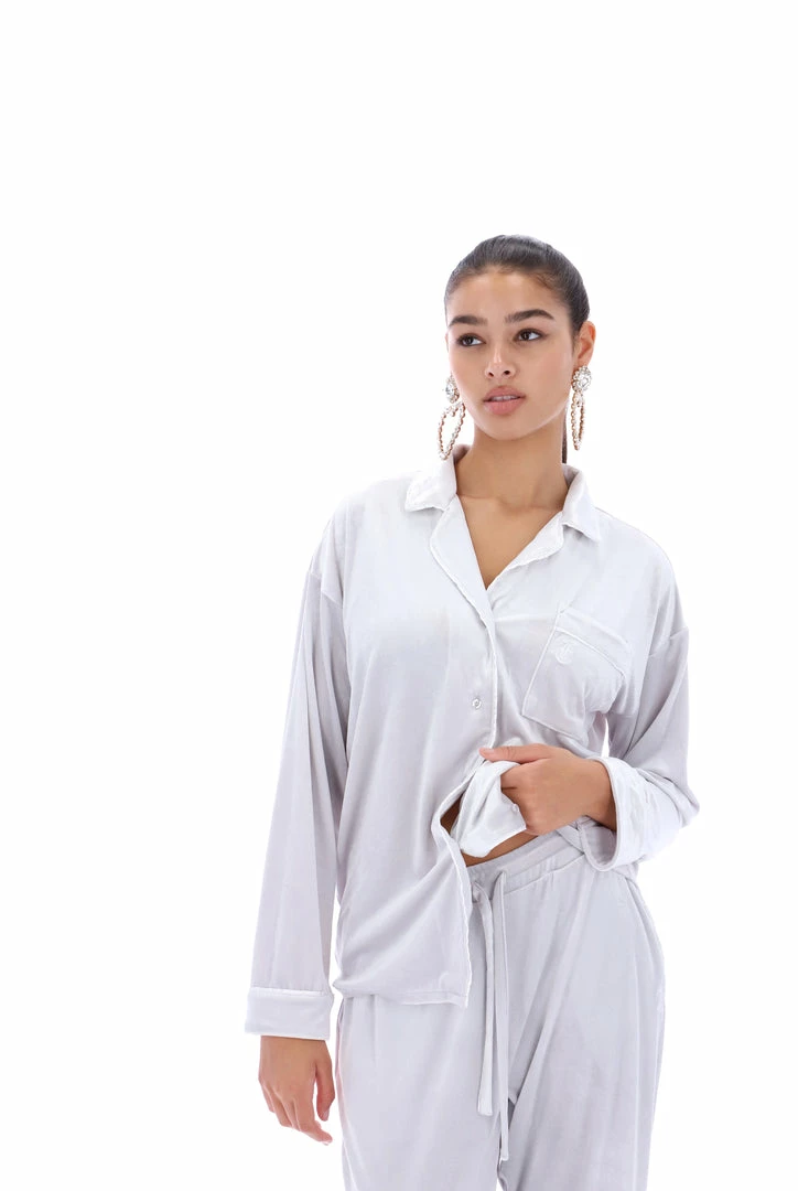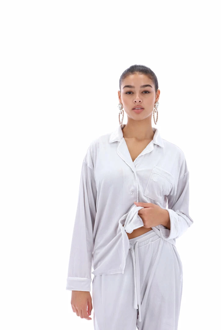 Pyjama shirt in grey velvet. This shirt features contrast piping and is branded with a JC crest on left chest pocket and our classic gothic ‘Juicy Couture’ across back. Pair with the matching pyjama bottoms for a luxe loungewear look.