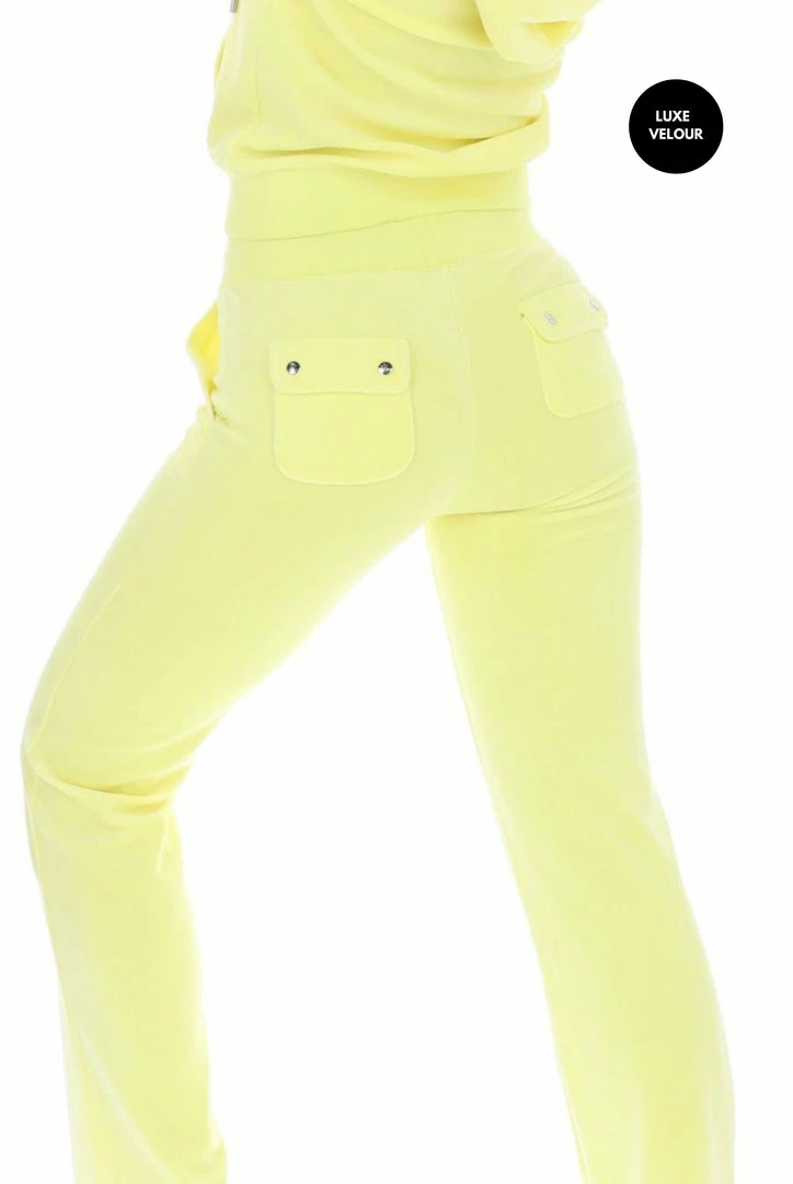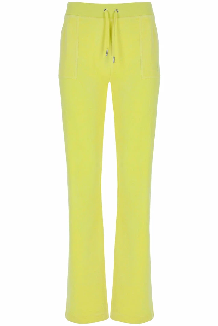 Mid-rise plain tracksuit bottoms in lemon drop cotton rich luxe velour; the original Juicy Couture fabrication. Part of the Black Label collection; flared leg fit, with adjustable drawstring ribbed waist and front feature patch pockets. These joggers feature back popper fastening pockets, silver branded hardware and are finished with a tonal embroidered JC logo at the hip.