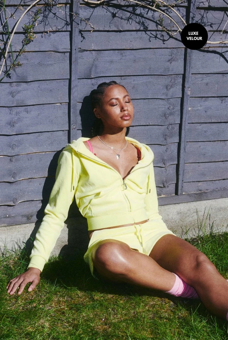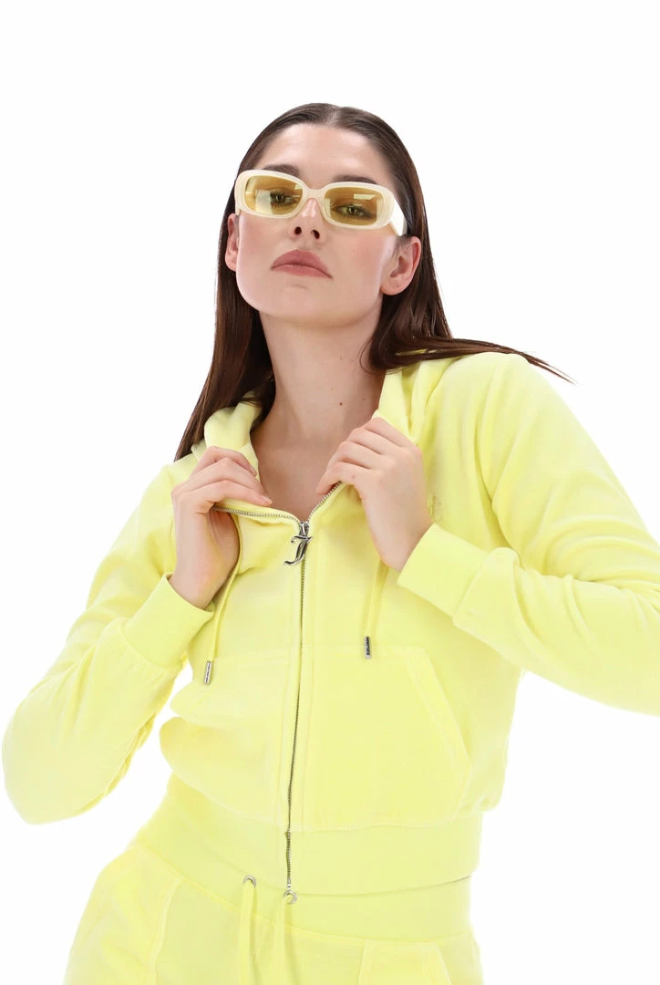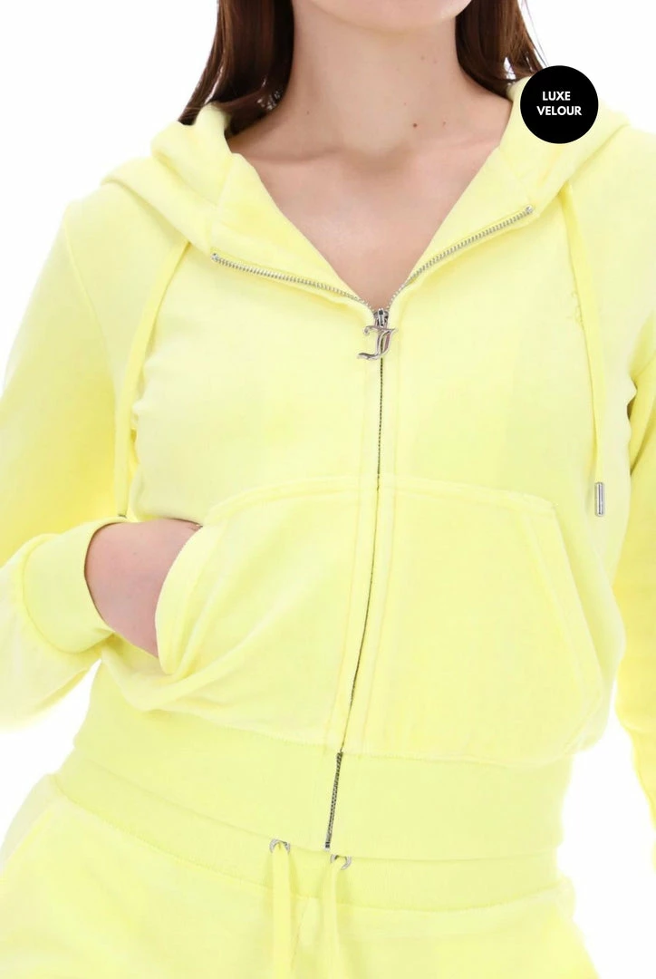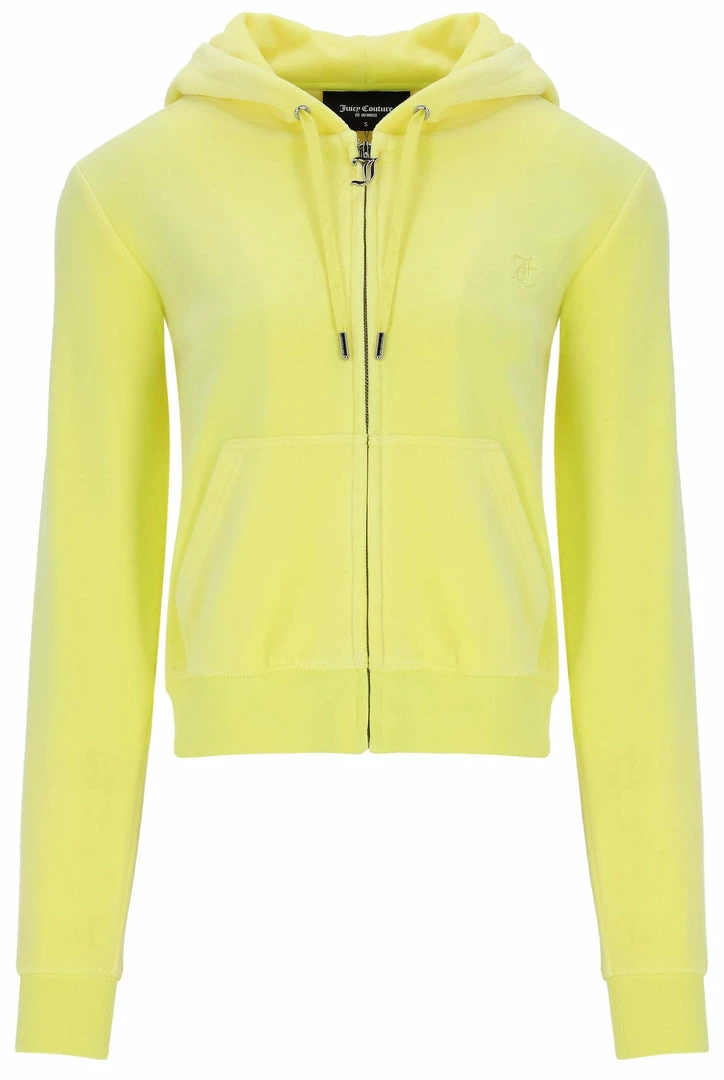 Our legendary zip through staple hoodie in lemon dropΒ luxe cotton rich velour; the original Juicy Couture fabrication. Part of the Black Label collection; slim fit, with kangaroo pocket and a self-fabric lined hood, this hoodie features a statement gothic J zip pull and is branded with a tonal embroidered JC logo at the chest.