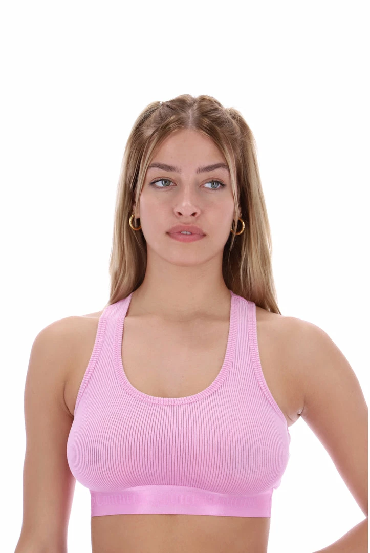 Scoop front racer bra in orchid ribbed velour. This bra features a double layer for soft support through front and is branded with a jacquard tonal elasticated hem.