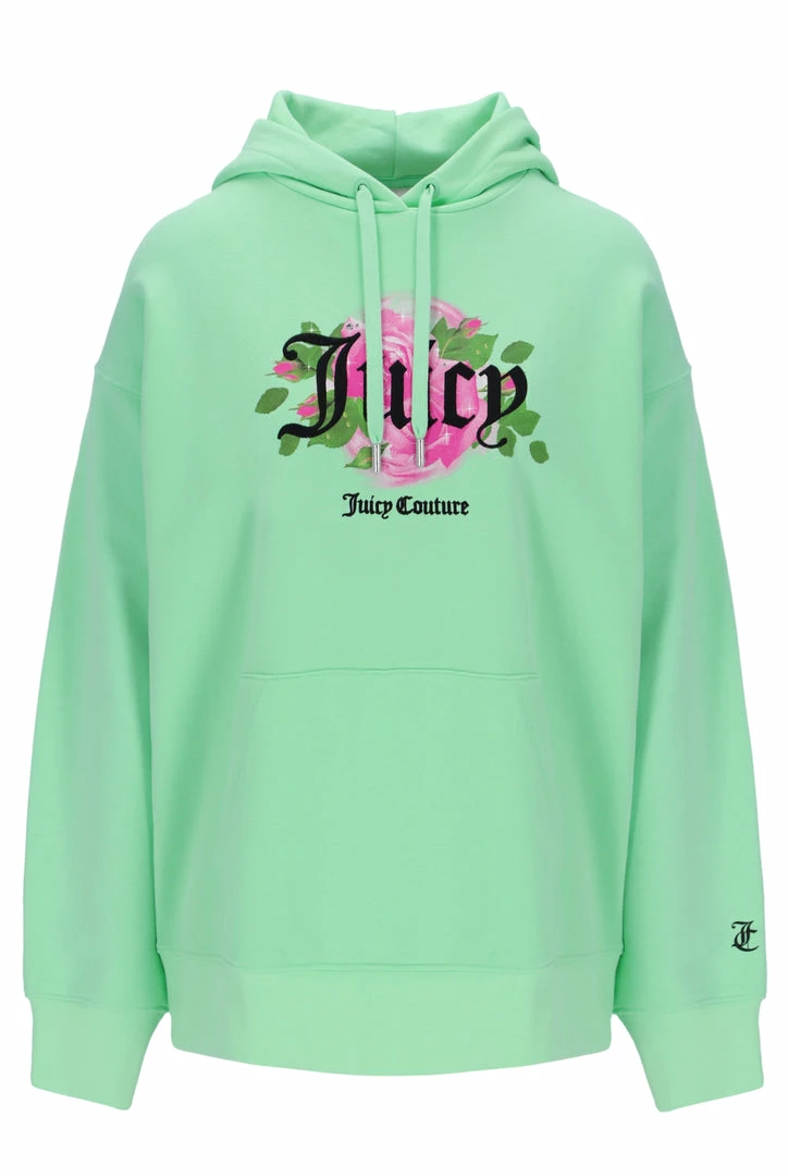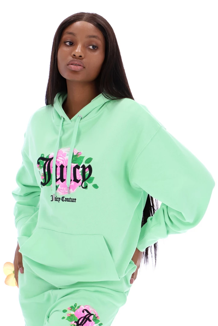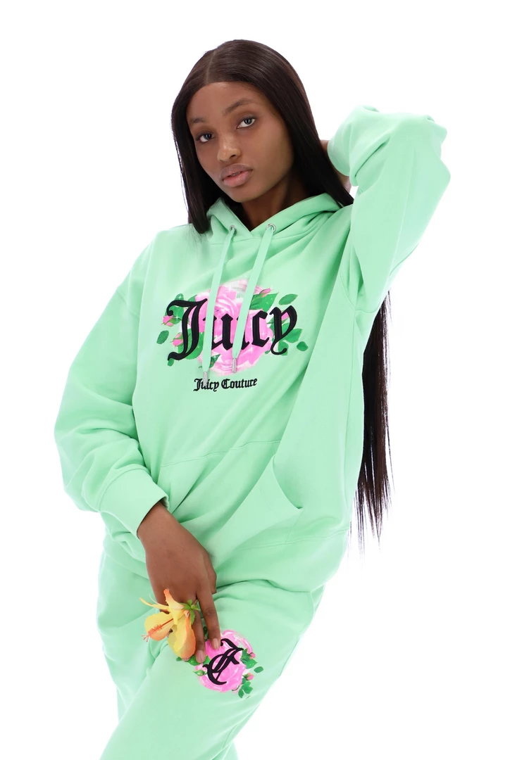Floral graphic cotton hoodie in mint brushback fleece. This boyfriend fit hoodie features a a digital fantasy floral print graphic across chest and is branded with an embroidered ‘Juicy’ gothic logo overlay. Finished with branded silver hardware, kangroo front pocket and ribbed hem and cuffs. Pair with the matching graphic joggers to complete this relaxed look.