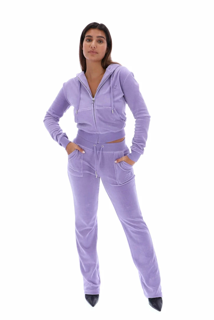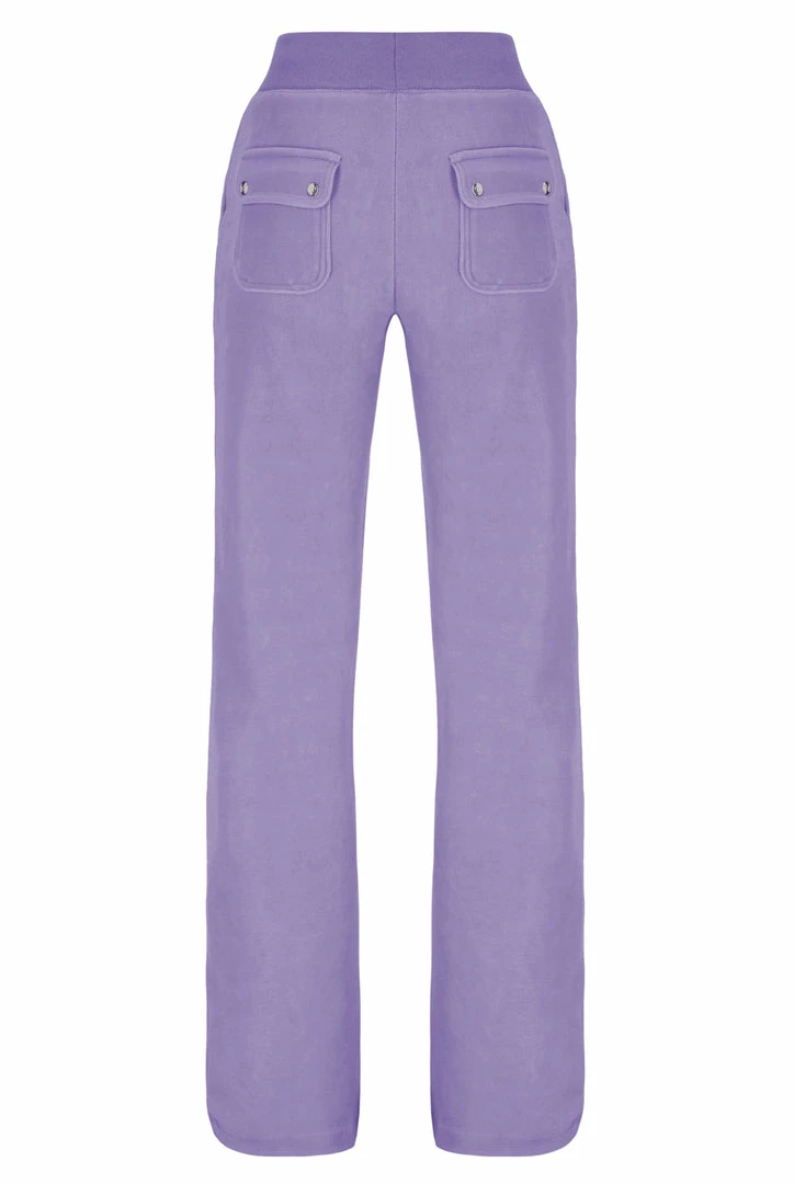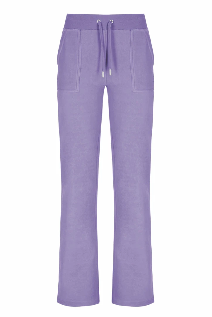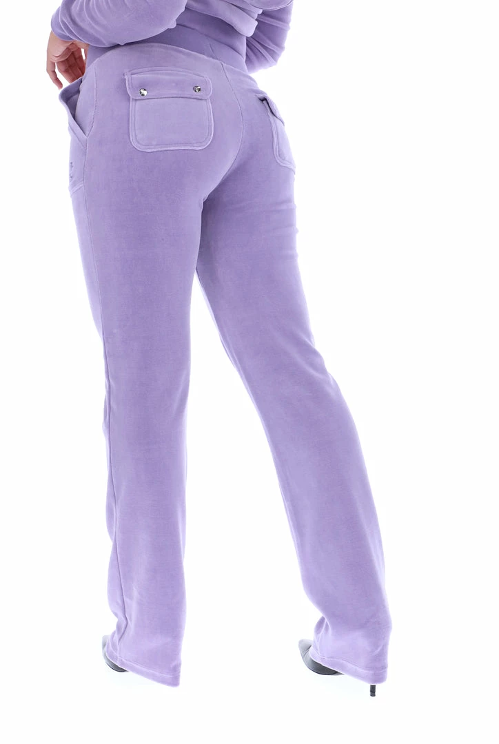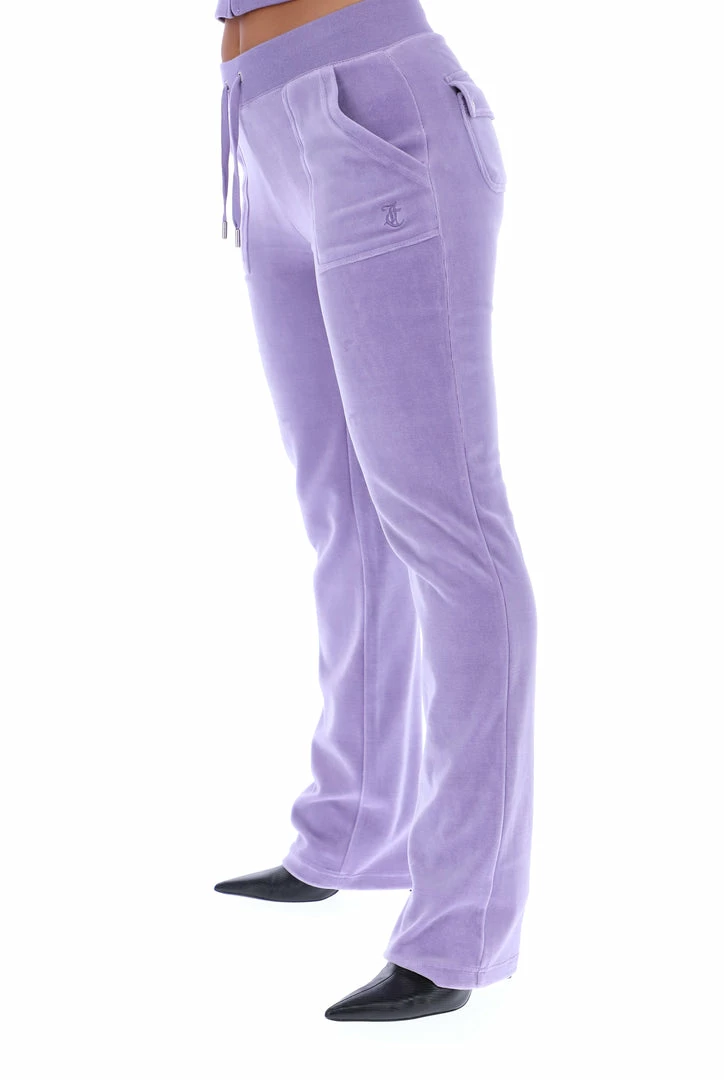 Mid-rise plain tracksuit bottoms in daybreak cotton rich luxe velour; the original Juicy Couture fabrication. Part of the Black Label collection; flared leg fit, with adjustable drawstring ribbed waist and front feature patch pockets. These joggers feature back popper fastening pockets, silver branded hardware and are finished with a tonal embroidered JC logo at the hip.