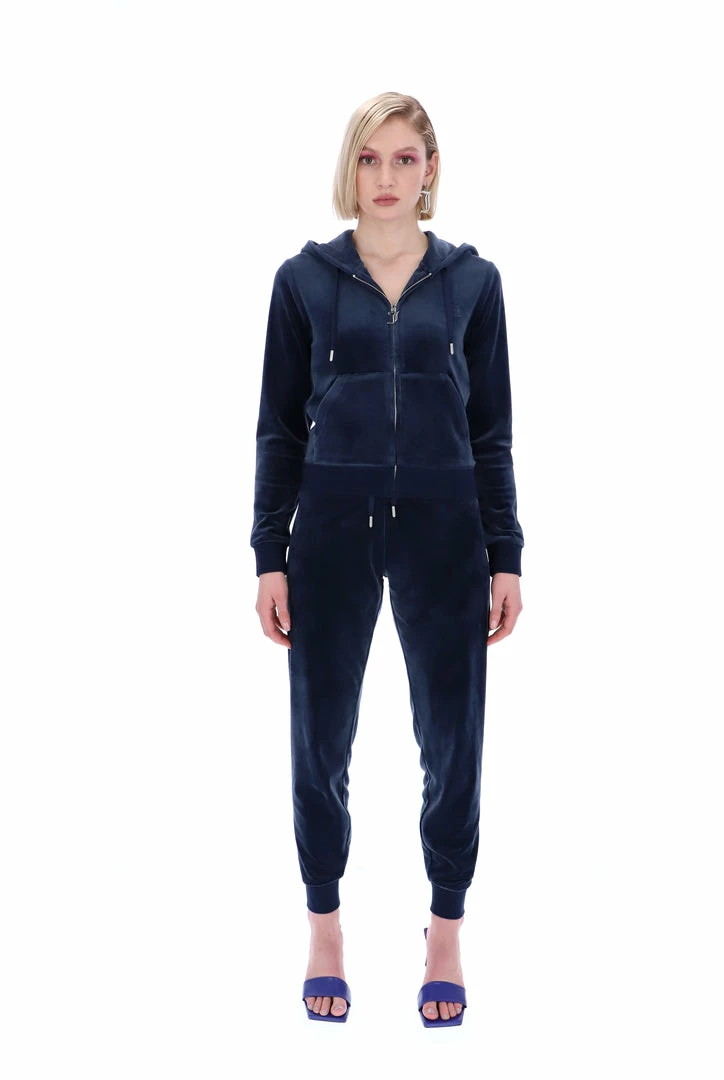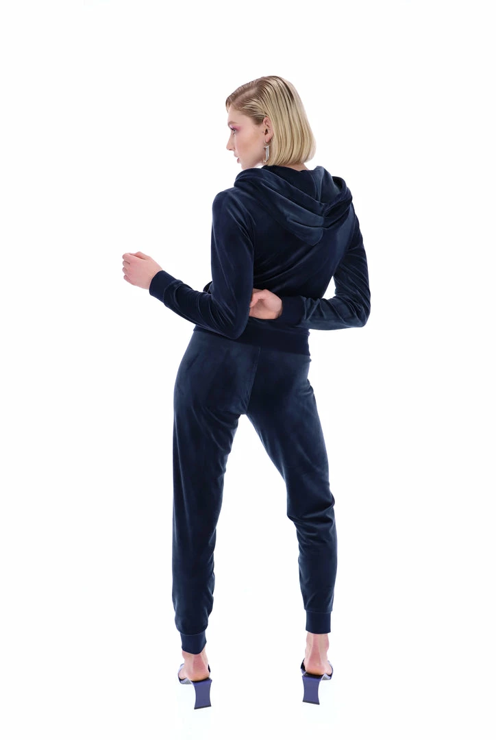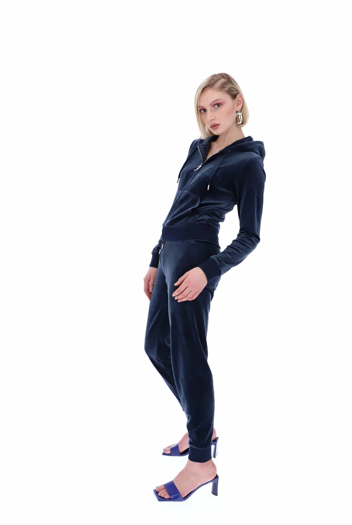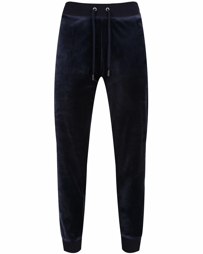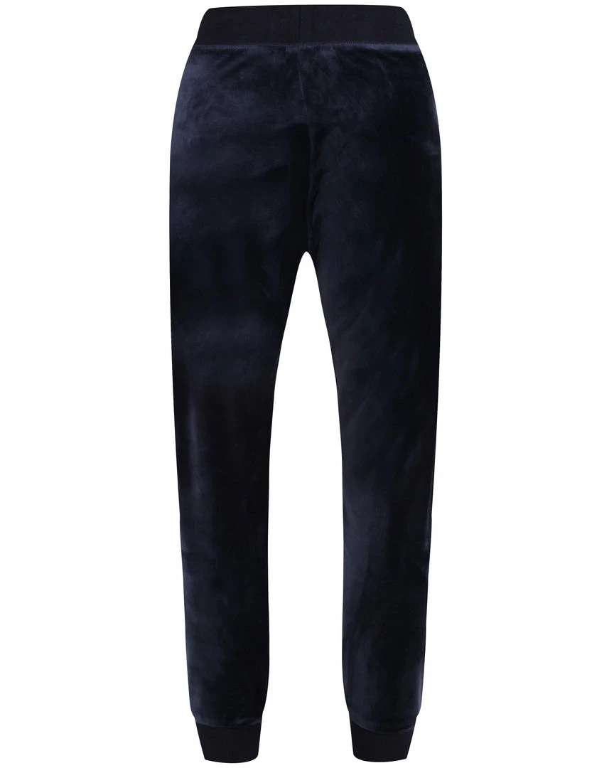 Mid-rise cuffed core joggers in night sky classic velour. Flattering slim leg fit with adjustable drawstring ribbed waist, these core joggers are branded with silver hardware and a tonal embroidered JC logo at the hip.
