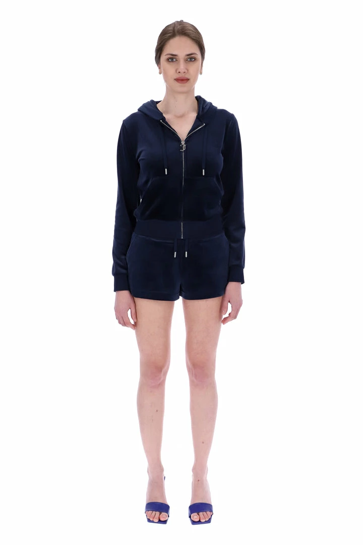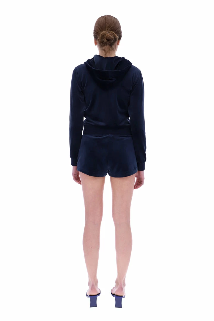 Mid-rise plain shorts in night sky classic velour. A short flirty fit, with adjustable drawstring ribbed waist and front angled pockets. These iconic core track shorts are branded with silver hardware and a tonal embroidered JC logo at the hip. Pair with the Robertson hoodie for a summer update on the staple tracksuit.